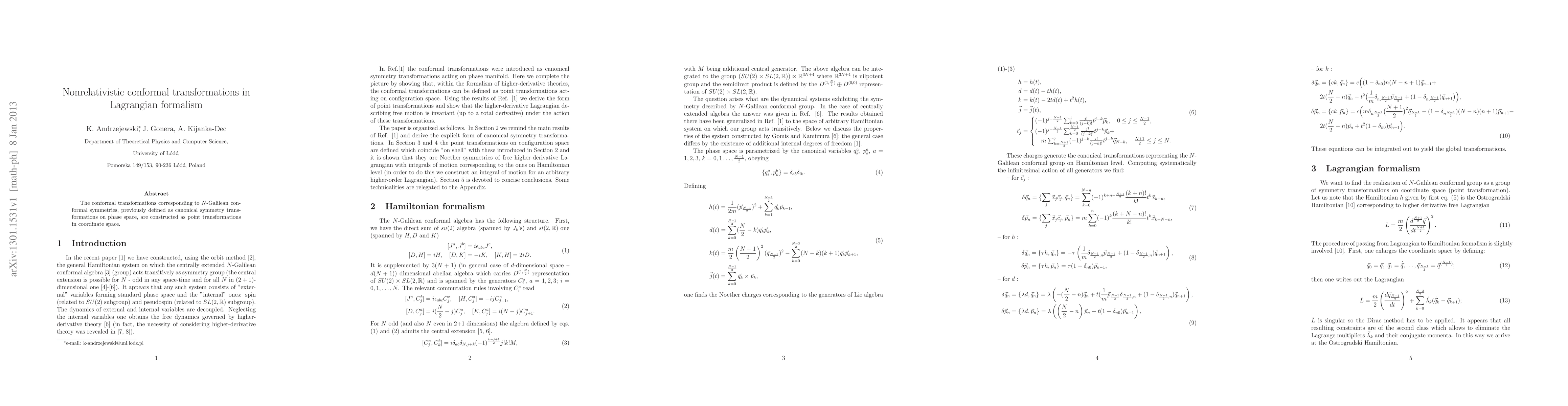 The conformal transformations corresponding to $N$-Galilean conformal symmetries, previously defined as canonical symmetry transformations on phase space, are constructed as point transformations in coordinate space.