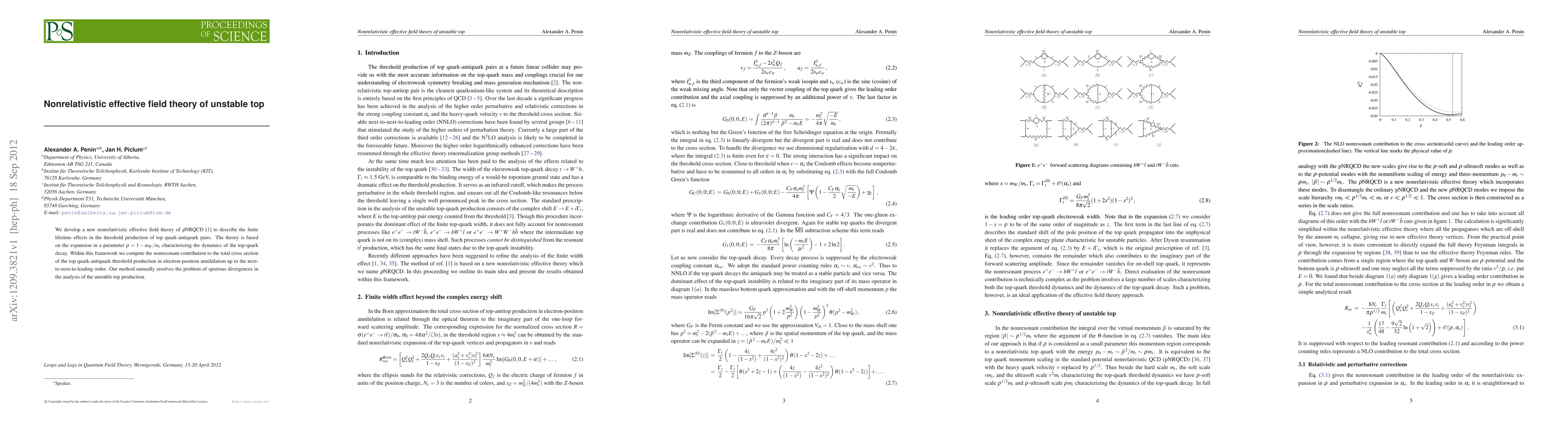 We develop a new nonrelativistic effective field theory of $\rho$NRQCD [1] to describe the finite lifetime effects in the threshold production of top quark-antiquark pairs. The theory is based on the expansion in a parameter $\rho=1-m_W/m_t$ characterizing the dynamics of the top-quark decay. Within this framework we compute the nonresonant contribution to the total cross section of the top quark-antiquark threshold production in electron-positron annihilation up to the next-to-next-to-leading order. Our method naturally resolves the problem of spurious divergences in the analysis of the unstable top production.