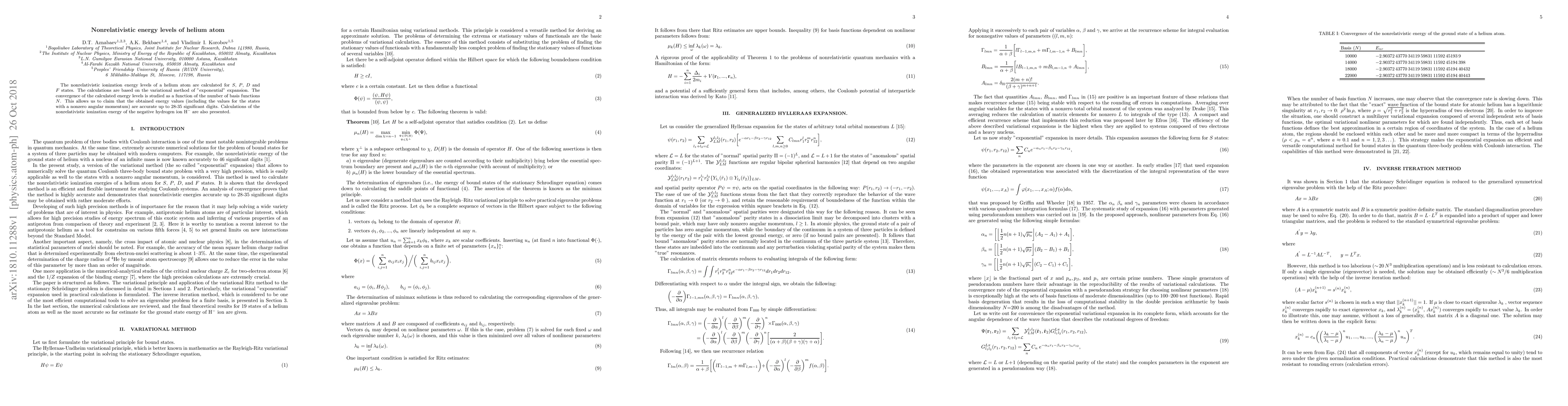 This paper calculates the nonrelativistic ionization energy levels of helium atom $S$, $P$, $D$, and $F$ states using the variational method with exponential expansion. The study demonstrates high accuracy, up to 28-35 significant digits, and also includes calculations for the negative hydrogen ion H$^-$.