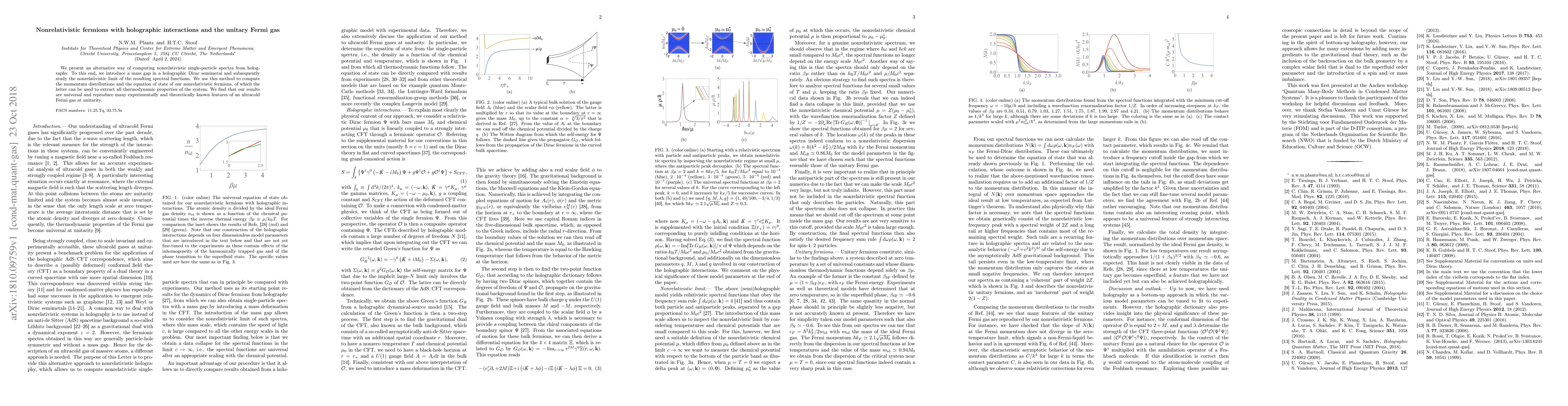 We present an alternative way of computing nonrelativistic single-particle spectra from holography. To this end, we introduce a mass gap in a holographic Dirac semimetal and subsequently study the nonrelativistic limit of the resulting spectral functions. We use this method to compute the momentum distributions and the equation of state of our nonrelativistic fermions, of which the latter can be used to extract all thermodynamic properties of the system. We find that our results are universal and reproduce many experimentally and theoretically known features of an ultracold Fermi gas at unitarity.