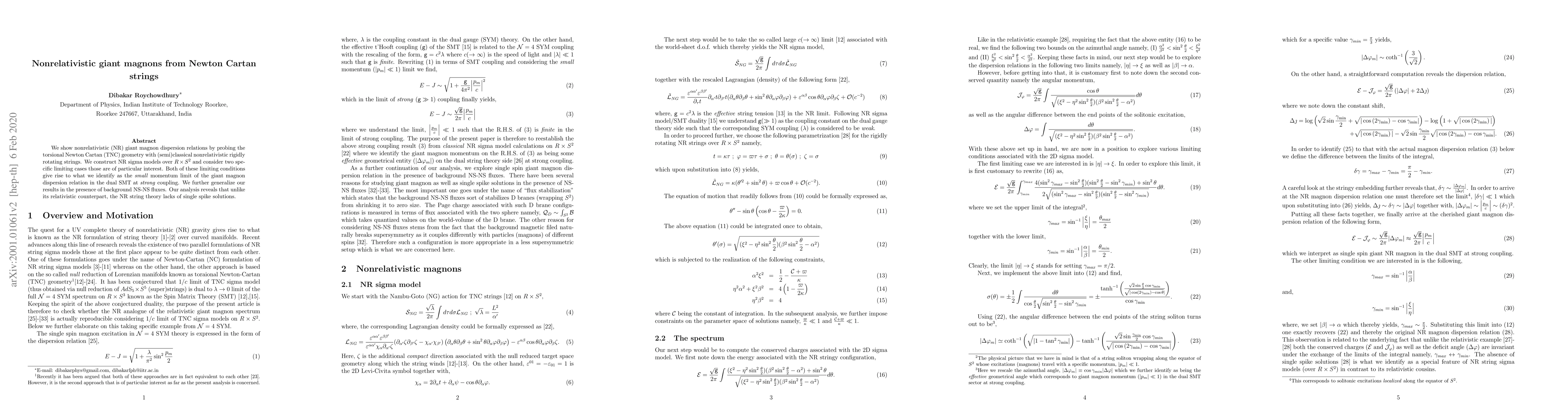 This paper investigates nonrelativistic giant magnons through torsional Newton Cartan geometry using semiclassical nonrelativistic strings. It constructs nonrelativistic sigma models and finds that unlike relativistic strings, nonrelativistic strings lack single spike solutions, even in the small momentum limit.