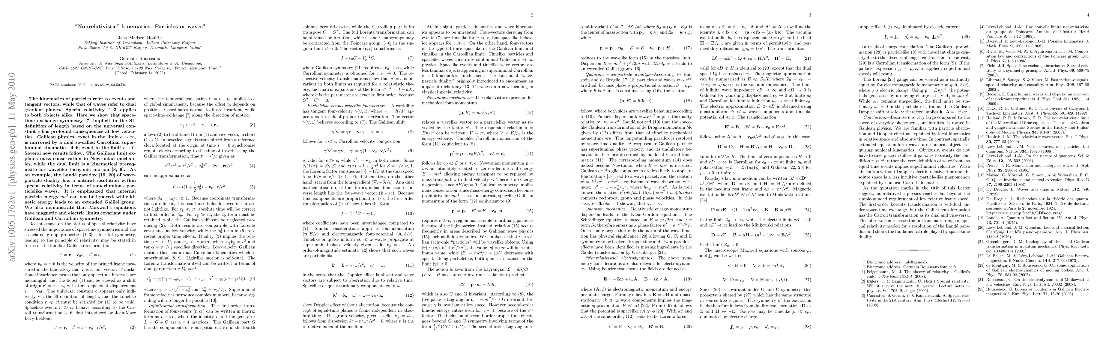 The kinematics of particles refer to events and tangent vectors, while that of waves refer to dual gradient planes. Special relativity [1-3] applies to both objects alike. Here we show that spacetime exchange symmetry [7] implicit in the SIdefinition of length based on the universal constant c has profound consequences at low velocities. Galilean physics, exact in the limit c \to \infty, is mirrored by a dual so-called Carrollian superluminal kinematics [4-6] exact in the limit c \to 0. Several new results follow. The Galilean limit explains mass conservation in Newtonian mechanics, while the dual limit is a kinematical prerequisite for wavelike tachyonic motion [8, 9]. As an example, the Land\'e paradox [19, 20] of waveparticle duality has a natural resolution within special relativity in terms of superluminal, particlelike waves. It is emphasized that internal particle energy mc^2 can not be ignored, while kinetic energy leads to an extended Galilei group. We also demonstrate that Maxwell's equations have magnetic and electric limits covariant under Galilean and Carrollian symmetry.