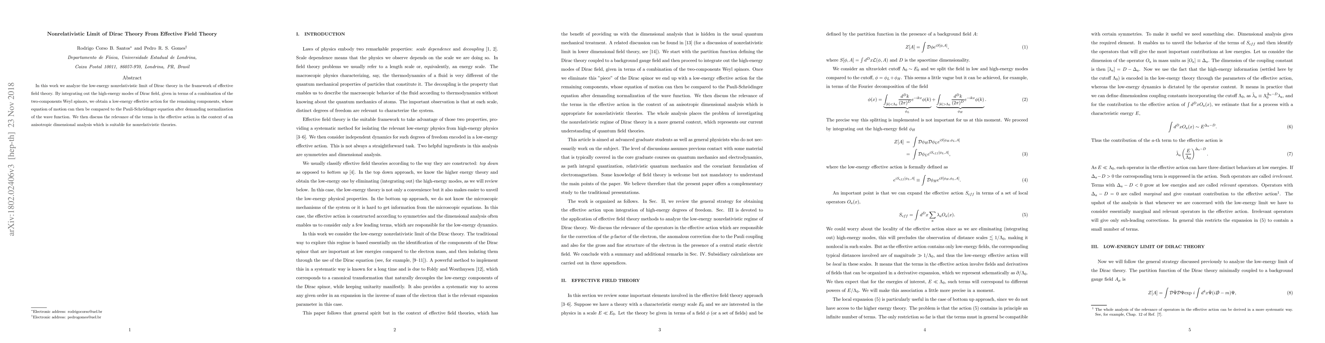 This paper derives the low energy nonrelativistic limit of Dirac theory using effective field theory, obtaining an effective action for the remaining components and comparing it to the Pauli-Schrödinger equation, while discussing the relevance of terms through an anisotropic dimensional analysis.