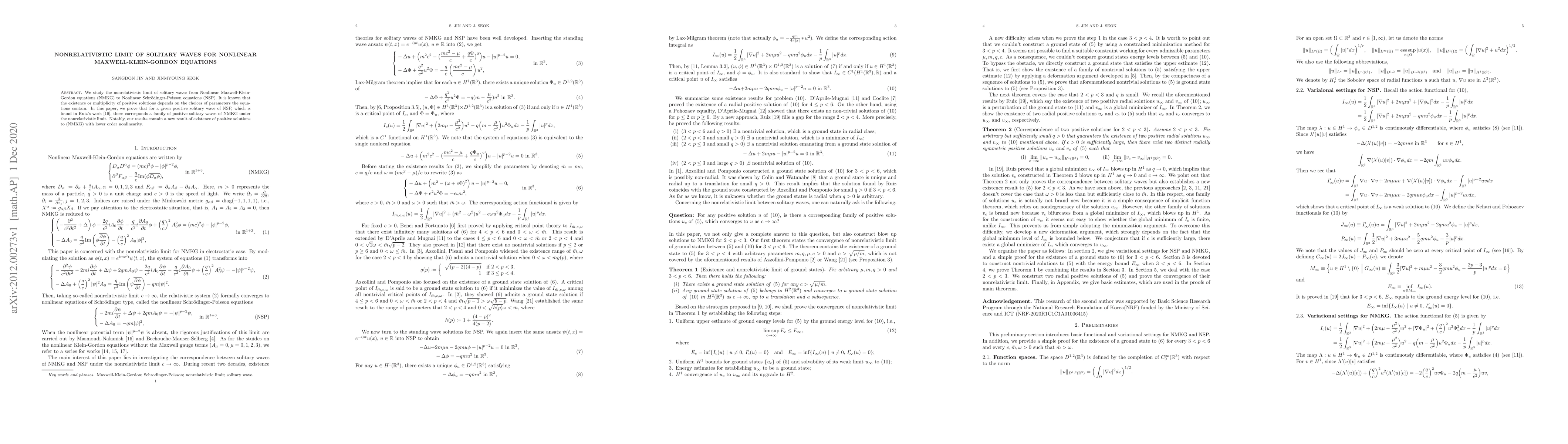 This paper investigates the nonrelativistic limit of solitary waves from Nonlinear Maxwell-Klein-Gordon equations to Nonlinear Schrödinger-Poisson equations, demonstrating the existence of a family of positive solitary waves of NMKG corresponding to a given positive solitary wave of NSP. It introduces a new result on the existence of positive solutions to NMKG with lower order nonlinearity.