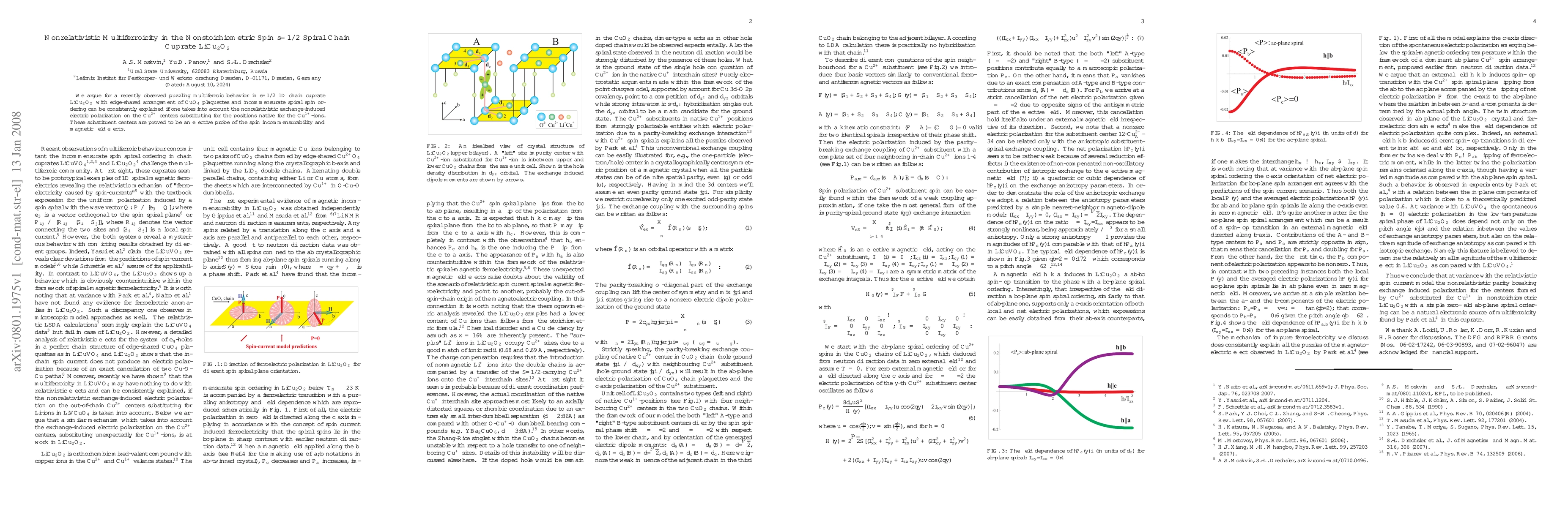 We argue for a recently observed puzzling multiferroic behavior in s=1/2 1D chain cuprate LiCu2O2 with edge-shared arrangement of CuO4 plaquettes and incommensurate spiral spin ordering can be consistently explained if one takes into account the nonrelativistic exchange-induced electric polarization on the Cu2+ centers substituting for the positions native for the Cu1+ ions. These substituent centers are proved to be an effective probe of the spin incommensurability and magnetic field effects.