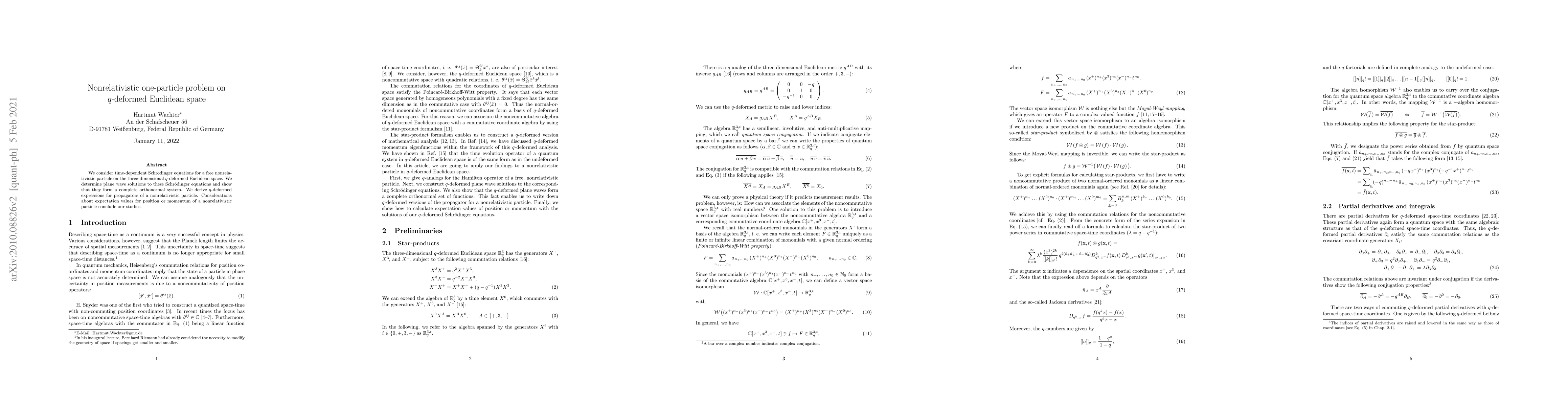 This paper investigates time-dependent Schrödinger equations for a free nonrelativistic particle in three-dimensional $q$-deformed Euclidean space, deriving plane wave solutions that form a complete orthonormal system and $q$-deformed propagators, concluding with considerations on position and momentum expectation values.