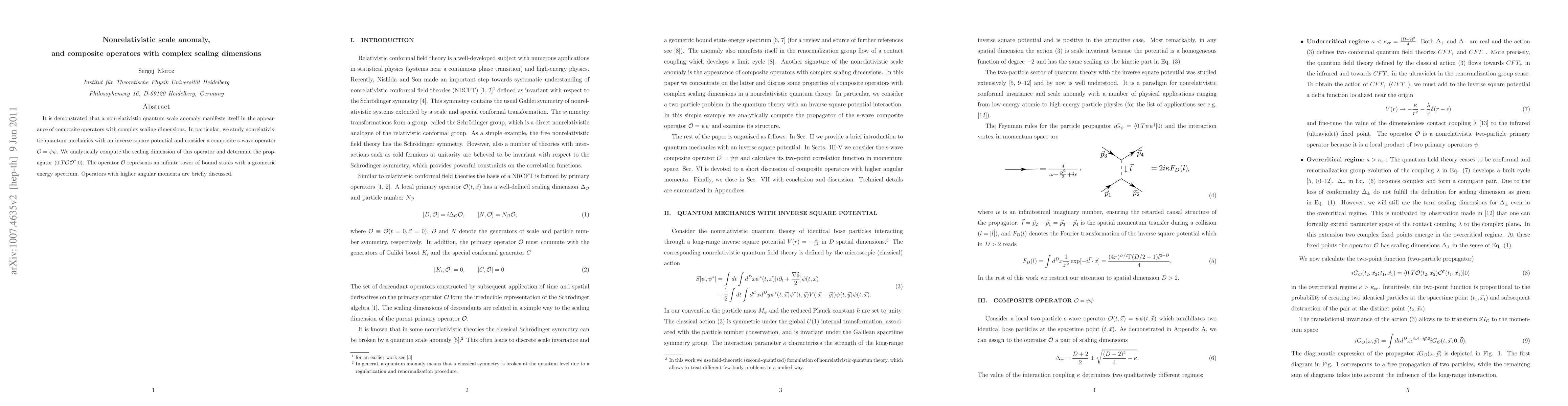 This paper demonstrates that nonrelativistic quantum scale anomaly leads to composite operators with complex scaling dimensions, specifically analyzing an s-wave operator in nonrelativistic quantum mechanics with an inverse square potential. The study analytically computes the scaling dimension and propagator of the operator, revealing a geometric energy spectrum for bound states.