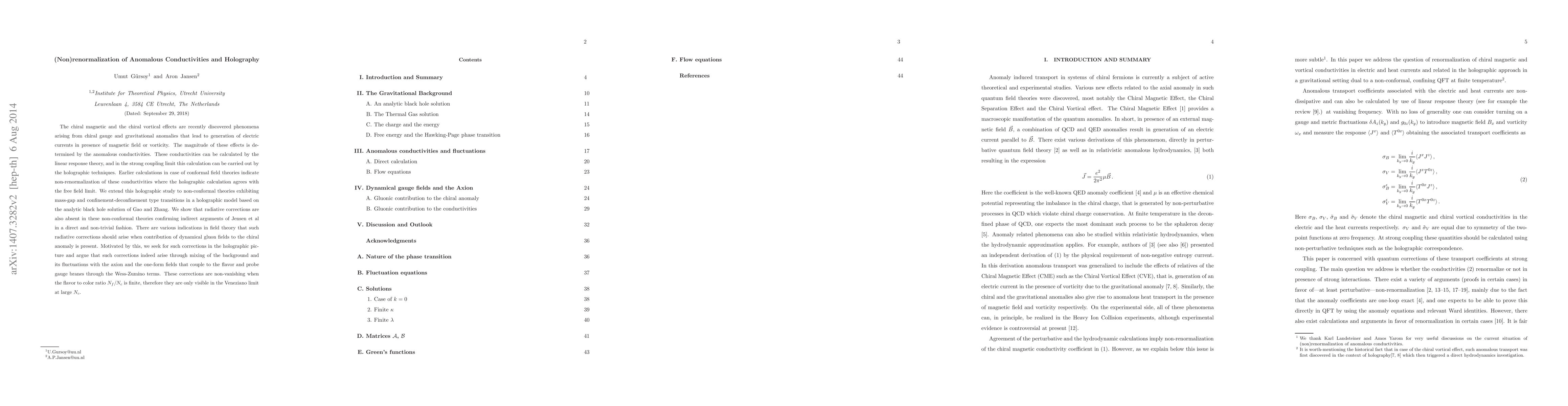 The chiral magnetic and the chiral vortical effects are recently discovered phenomena arising from chiral gauge and gravitational anomalies that lead to generation of electric currents in presence of magnetic field or vorticity. The magnitude of these effects is determined by the anomalous conductivities. These conductivities can be calculated by the linear response theory, and in the strong coupling limit this calculation can be carried out by the holographic techniques. Earlier calculations in case of conformal field theories indicate non-renormalization of these conductivities where the holographic calculation agrees with the free field limit. We extend this holographic study to non-conformal theories exhibiting mass-gap and confinement-deconfinement type transitions in a holographic model based on the analytic black hole solution of Gao and Zhang. We show that radiative corrections are also absent in these non-conformal theories confirming indirect arguments of Jensen et al in a direct and non-trivial fashion. There are various indications in field theory that such radiative corrections should arise when contribution of dynamical gluon fields to the chiral anomaly is present. Motivated by this, we seek for such corrections in the holographic picture and argue that such corrections indeed arise through mixing of the background and its fluctuations with the axion and the one-form fields that couple to the flavor and probe gauge branes through the Wess-Zumino terms. These corrections are non-vanishing when the flavor to color ratio $N_f/N_c$ is finite, therefore they are only visible in the Veneziano limit at large $N_c$.