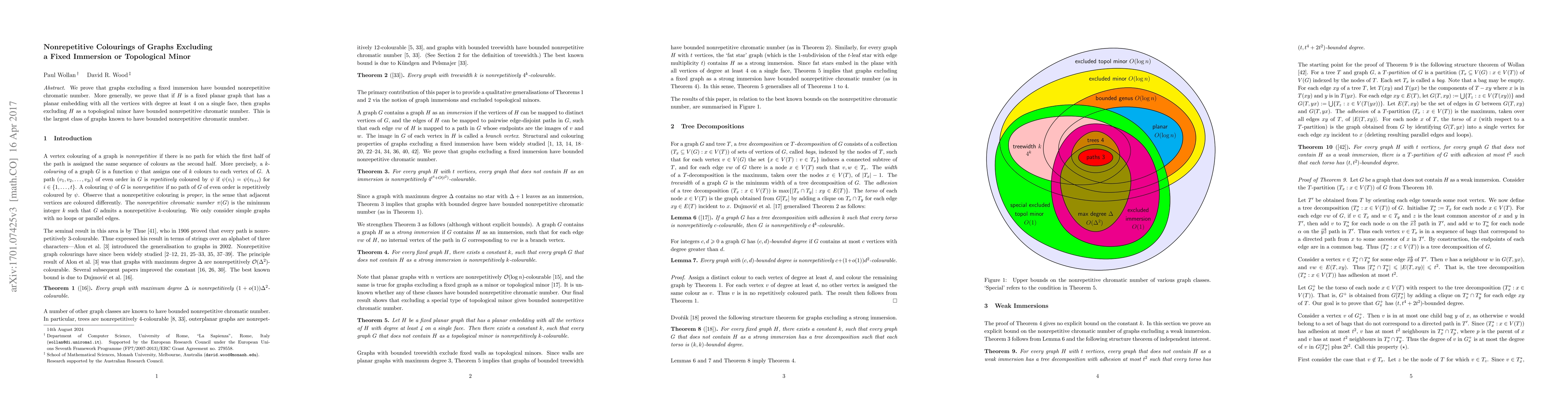 The research proves that graphs excluding a fixed immersion have bounded nonrepetitive chromatic number. It also demonstrates that if H is a fixed planar graph with all vertices of degree at least 4 on a single face, then graphs excluding H as a topological minor have bounded nonrepetitive chromatic number.
