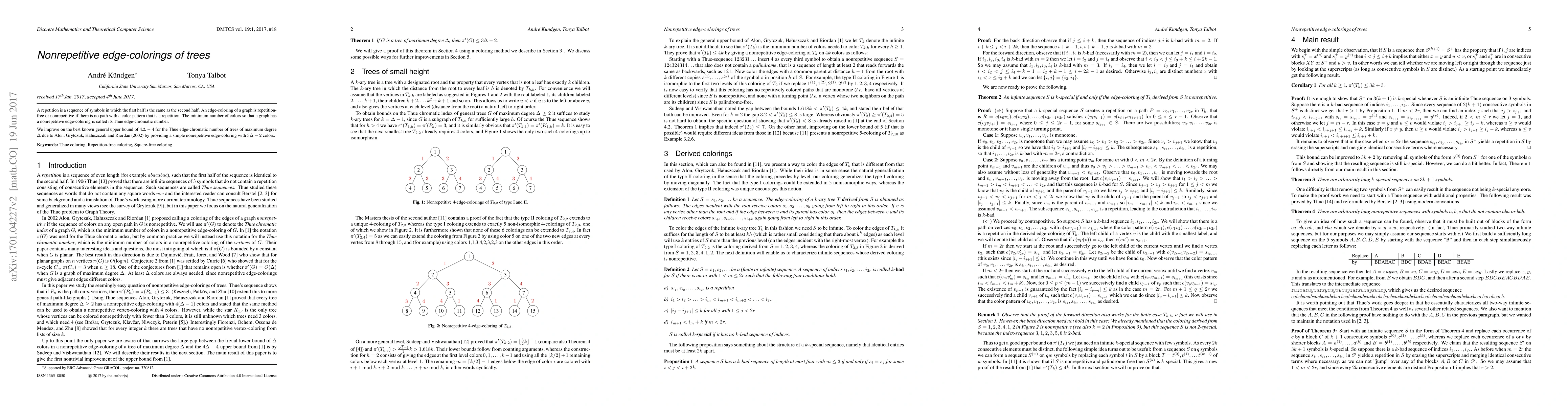 This paper improves the upper bound for the Thue edge-chromatic number of trees, reducing it from $4\Delta-4$ to $3\Delta-2$. It presents a simple nonrepetitive edge-coloring method to achieve this lower bound.