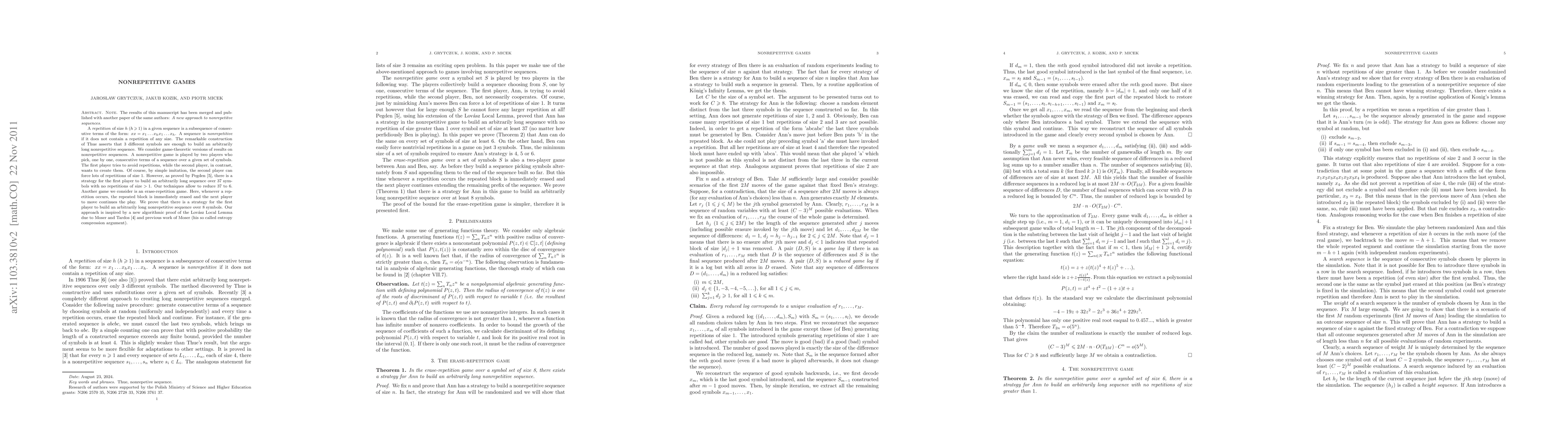 (Note. The results of this manuscript has been merged and published with another paper of the same authors: A new approach to nonrepetitve sequences.) A repetition of size $h$ ($h\geqslant1$) in a given sequence is a subsequence of consecutive terms of the form: $xx=x_1... x_hx_1... x_h$. A sequence is nonrepetitive if it does not contain a repetition of any size. The remarkable construction of Thue asserts that 3 different symbols are enough to build an arbitrarily long nonrepetitive sequence. We consider game-theoretic versions of results on nonrepetitive sequences. A nonrepetitive game is played by two players who pick, one by one, consecutive terms of a sequence over a given set of symbols. The first player tries to avoid repetitions, while the second player, in contrast, wants to create them. Of course, by simple imitation, the second player can force lots of repetitions of size 1. However, as proved by Pegden, there is a strategy for the first player to build an arbitrarily long sequence over 37 symbols with no repetitions of size $>1$. Our techniques allow to reduce 37 to 6. Another game we consider is an erase-repetition game. Here, whenever a repetition occurs, the repeated block is immediately erased and the next player to move continues the play. We prove that there is a strategy for the first player to build an arbitrarily long nonrepetitive sequence over 8 symbols. Our approach is inspired by a new algorithmic proof of the Lov\'asz Local Lemma due to Moser and Tardos and previous work of Moser (his so called entropy compression argument).