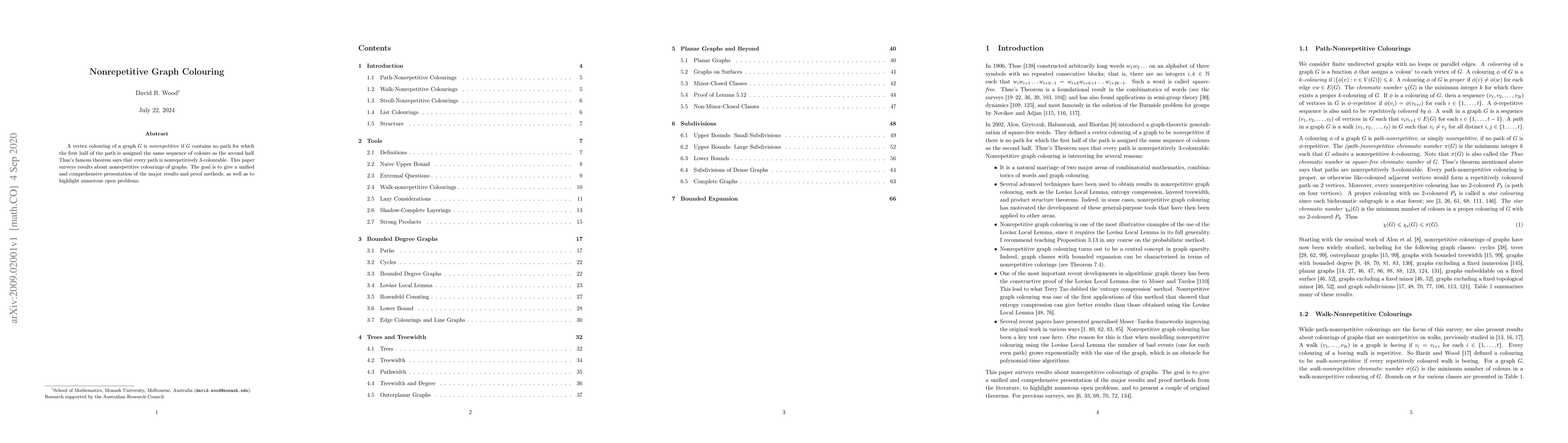 This paper surveys results on nonrepetitive graph colouring, where no path repeats its colour sequence in the first and second halves. It aims to present major findings and proof techniques, and to identify significant open problems in this area.