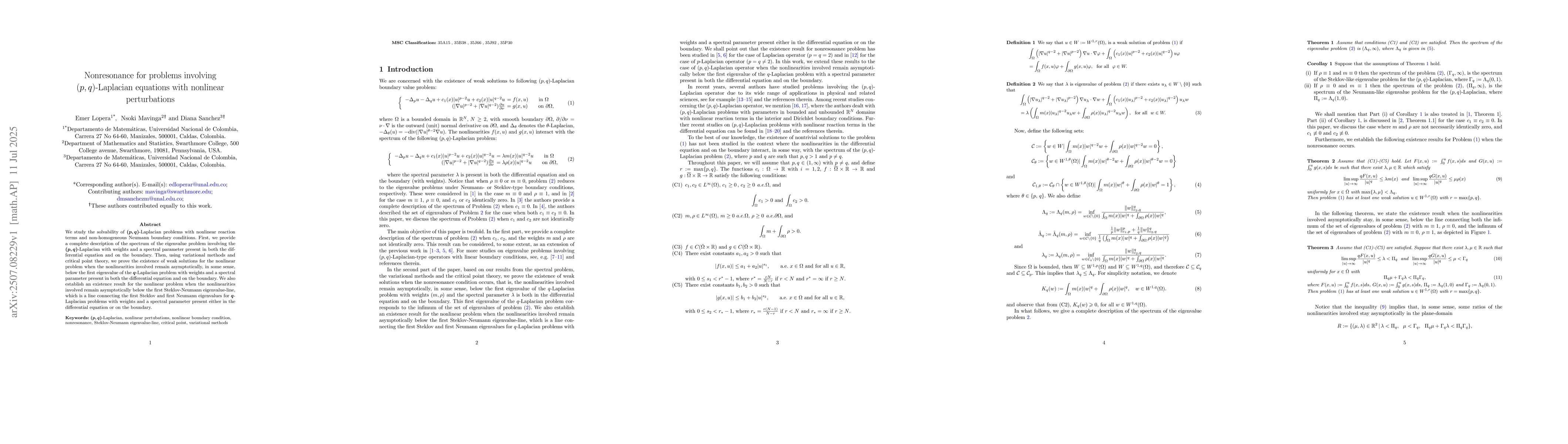 The paper provides a detailed spectral analysis of the $(p,q)$-Laplacian operator and applies variational techniques to prove existence results for nonlinear problems under certain conditions.