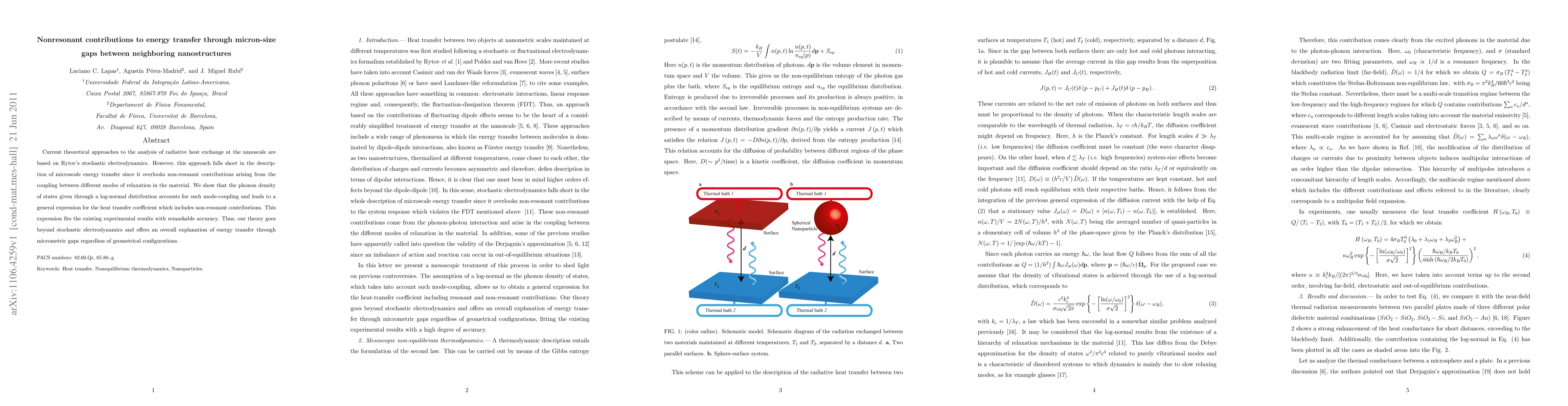 Current theoretical approaches to the analysis of radiative heat exchange at the nanoscale are based on Rytov's stochastic electrodynamics. However, this approach falls short in the description of microscale energy transfer since it overlooks non-resonant contributions arising from the coupling between different modes of relaxation in the material. We show that the phonon density of states given through a log-normal distribution accounts for such mode-coupling and leads to a general expression for the heat transfer coefficient which includes non-resonant contributions. This expression fits the existing experimental results with remarkable accuracy. Thus, our theory goes beyond stochastic electrodynamics and offers an overall explanation of energy transfer through micrometric gaps regardless of geometrical configurations.