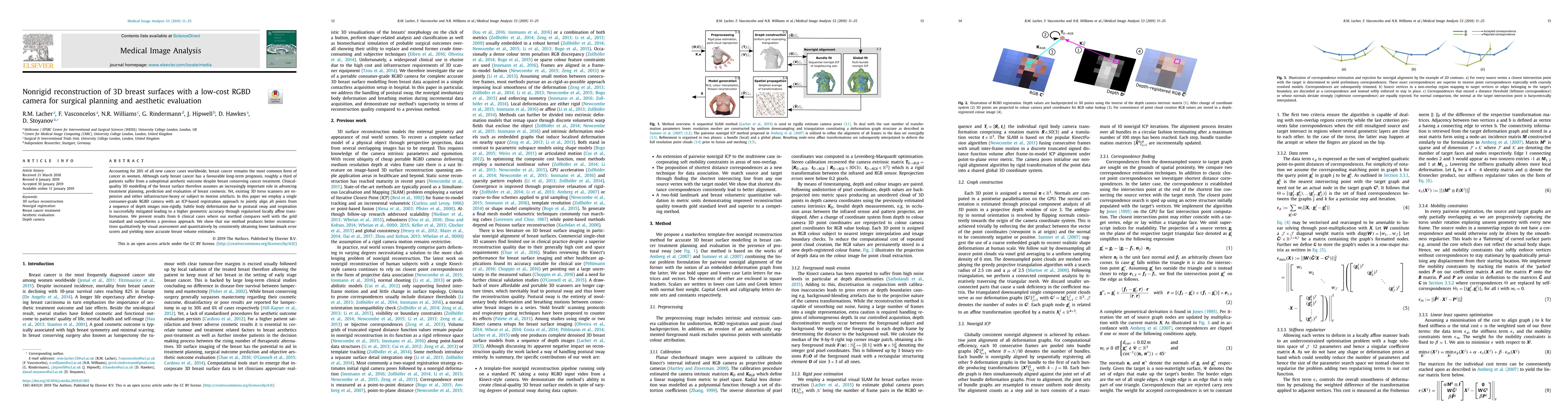 This paper proposes a cost-effective method using a low-cost RGBD camera and ICP-based registration for nonrigid reconstruction of 3D breast surfaces, improving surgical planning and aesthetic evaluation. The method achieves higher geometric accuracy and better reconstructions compared to previous approaches, as demonstrated through clinical case studies.