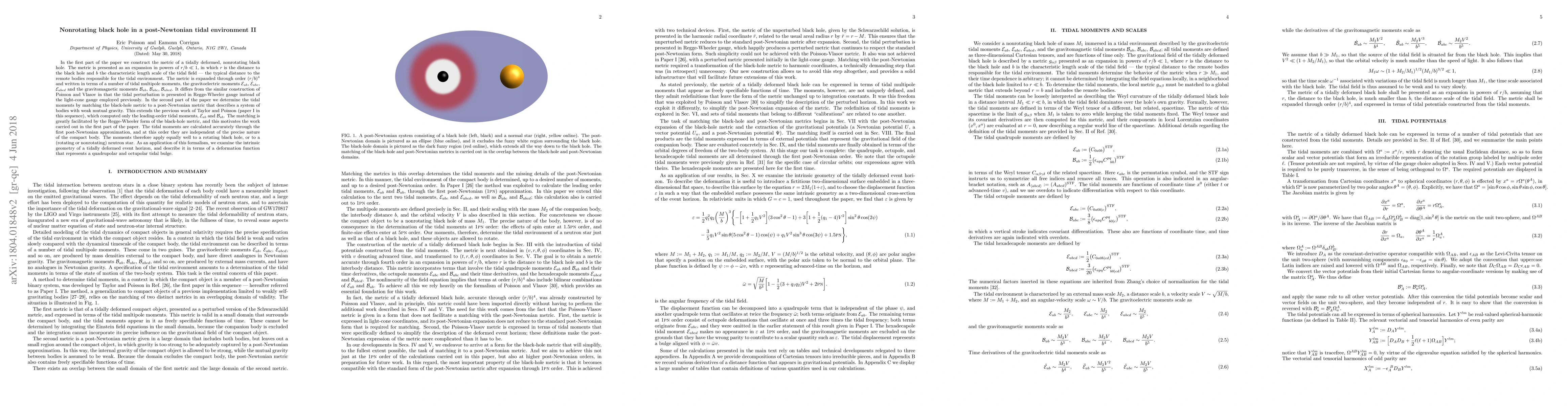 This paper constructs the metric for a tidally deformed, nonrotating black hole in a post-Newtonian tidal environment, expanding it in terms of tidal multipole moments and using the Regge-Wheeler gauge. The tidal moments are determined by matching the black-hole metric to a post-Newtonian metric, extending previous work to higher orders, and are applied to both black holes and neutron stars.
