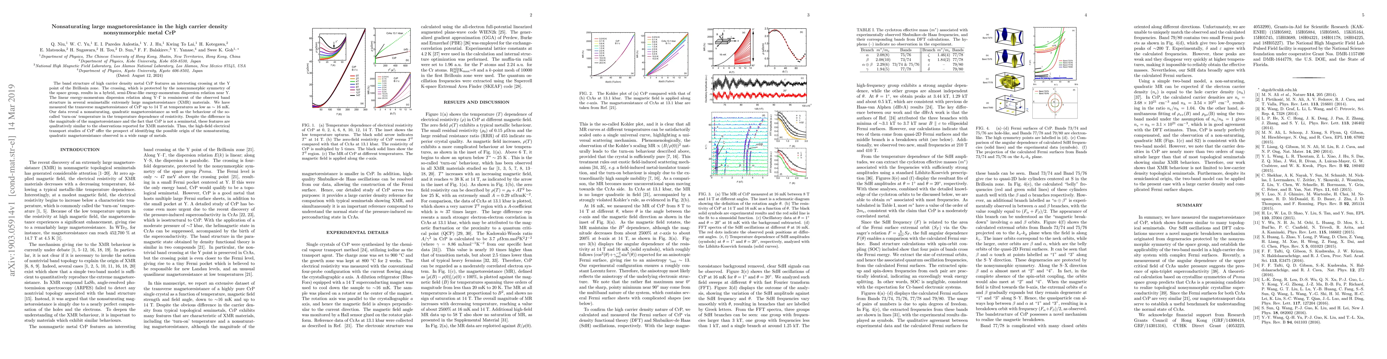 This paper investigates the band structure and magnetoresistance of the high carrier density metal CrP, revealing a nonsaturating, quadratic magnetoresistance similar to semimetallic XMR materials, despite CrP's distinct semi-Dirac-like dispersion and nonsemimetal nature. The findings suggest CrP as a potential model for studying the origins of large magnetoresistance.