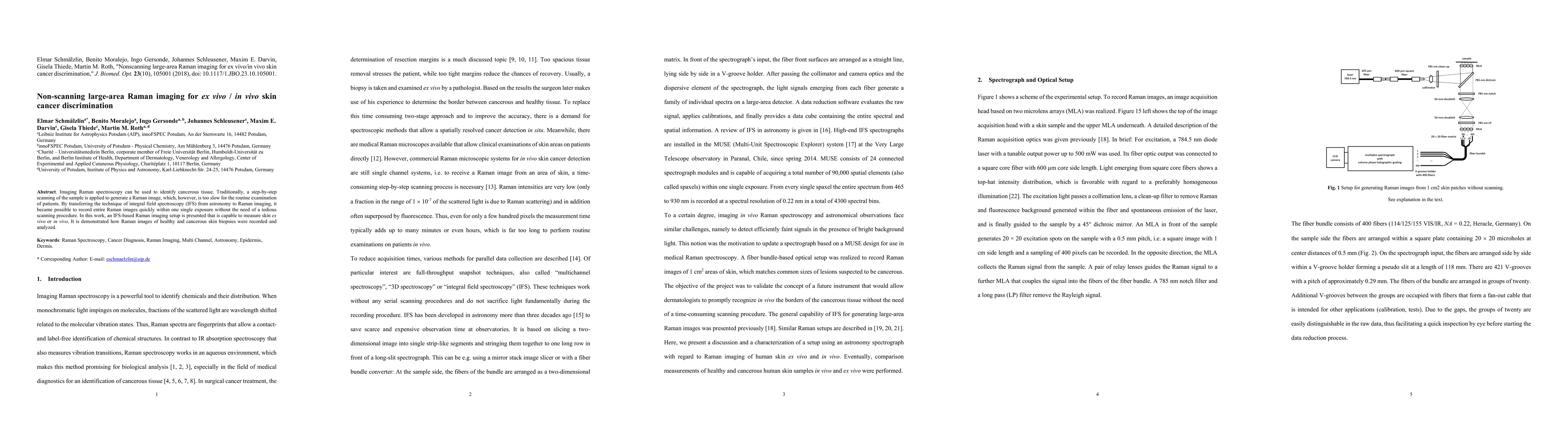 This paper presents a nonscanning Raman imaging technique using integral field spectroscopy (IFS) for rapid ex vivo/in vivo skin cancer discrimination. The IFS-based setup enables quick, single-exposure Raman imaging, significantly speeding up the examination process compared to traditional scanning methods.