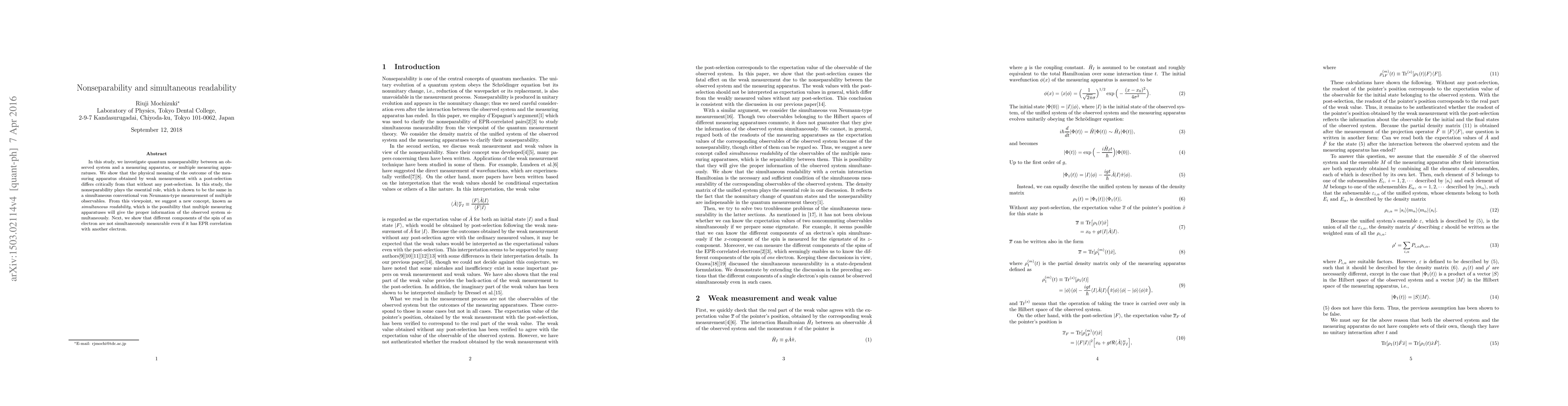 In this study, we investigate quantum nonseparability between an observed system and a measuring apparatus, or multiple measuring apparatuses. We show that the physical meaning of the outcome of the measuring apparatus obtained by weak measurement with a post-selection differs critically from that without any post-selection. In this study, the nonseparability plays the essential role, which is shown to be the same in a simultaneous conventional von Neumann-type measurement of multiple observables. From this viewpoint, we suggest a new concept, known as {\it simultaneous readability}, which is the possibility that multiple measuring apparatuses will give the proper information of the observed system simultaneously. Next, we show that different components of the spin of an electron are not simultaneously measurable even if it has EPR correlation with another electron.