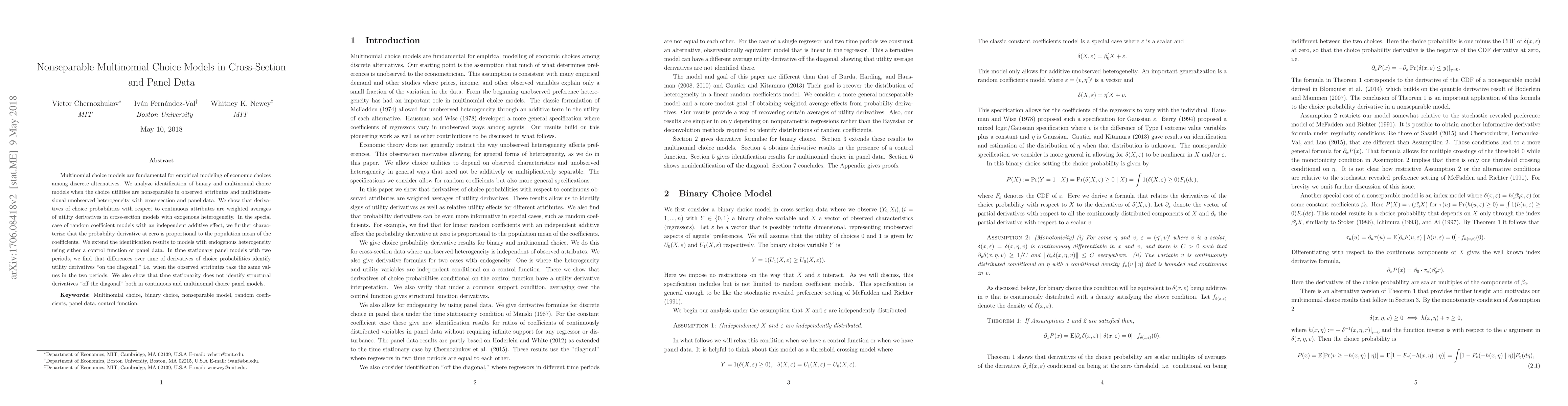 This paper investigates the identification of nonseparable multinomial choice models in cross-section and panel data, showing that derivatives of choice probabilities are weighted averages of utility derivatives in cross-section models. It also demonstrates that time differences in panel models identify utility derivatives when observed attributes remain constant over time.