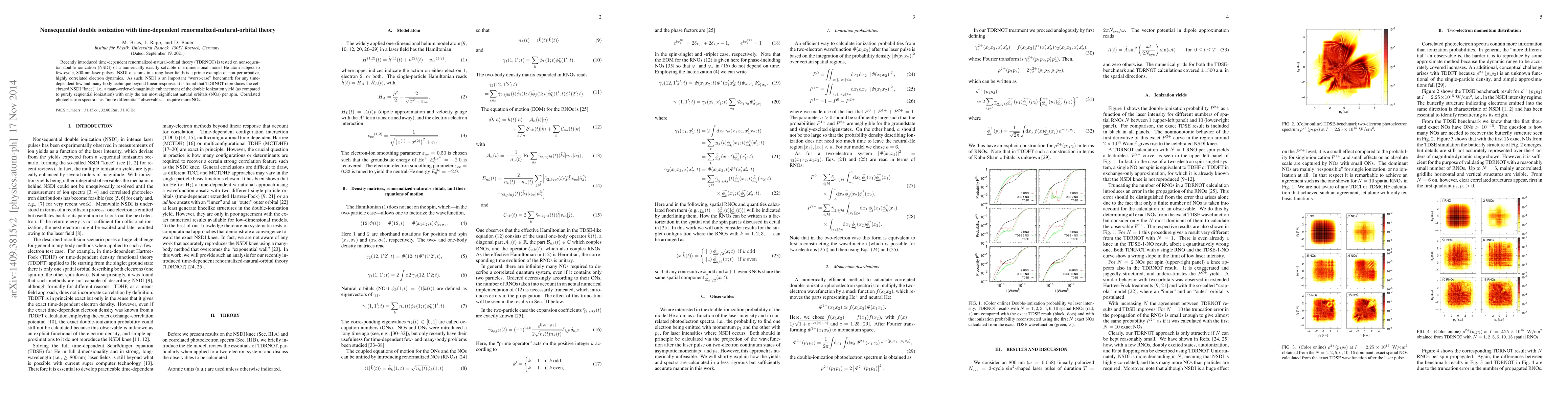 Recently introduced time-dependent renormalized natural orbital theory (TDRNOT) is tested on non-sequential double ionization (NSDI) of a numerically exactly solvable one-dimensional model He atom subject to few-cycle, 800-nm laser pulses. NSDI of atoms in strong laser fields is a prime example of non-perturbative, highly correlated electron dynamics. As such, NSDI is an important "worst-case" benchmark for any time-dependent few and many-body technique beyond linear response. It is found that TDRNOT reproduces the celebrated NSDI "knee," i.e., a many-order-of-magnitude enhancement of the double ionization yield (as compared to purely sequential ionization) with only the ten most significant natural orbitals (NOs) per spin. Correlated photoelectron spectra - as "more differential" observables - require more NOs.