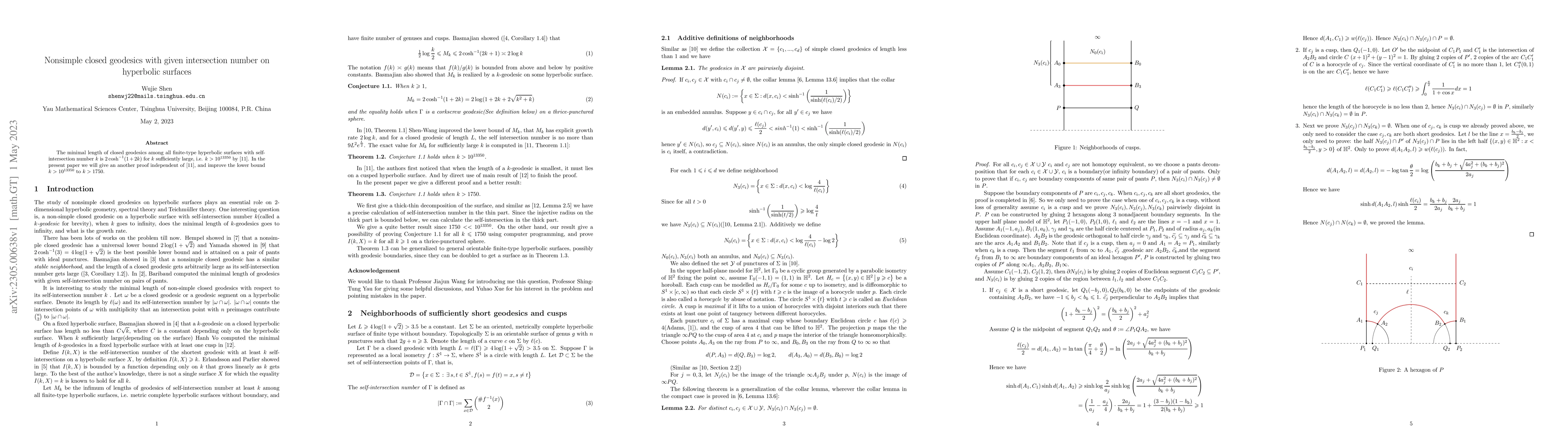 This paper provides an alternative proof for the minimal length of nonsimple closed geodesics on hyperbolic surfaces with a given self-intersection number $k$, improving the lower bound for $k$ from $10^{13350}$ to $k>1750$.