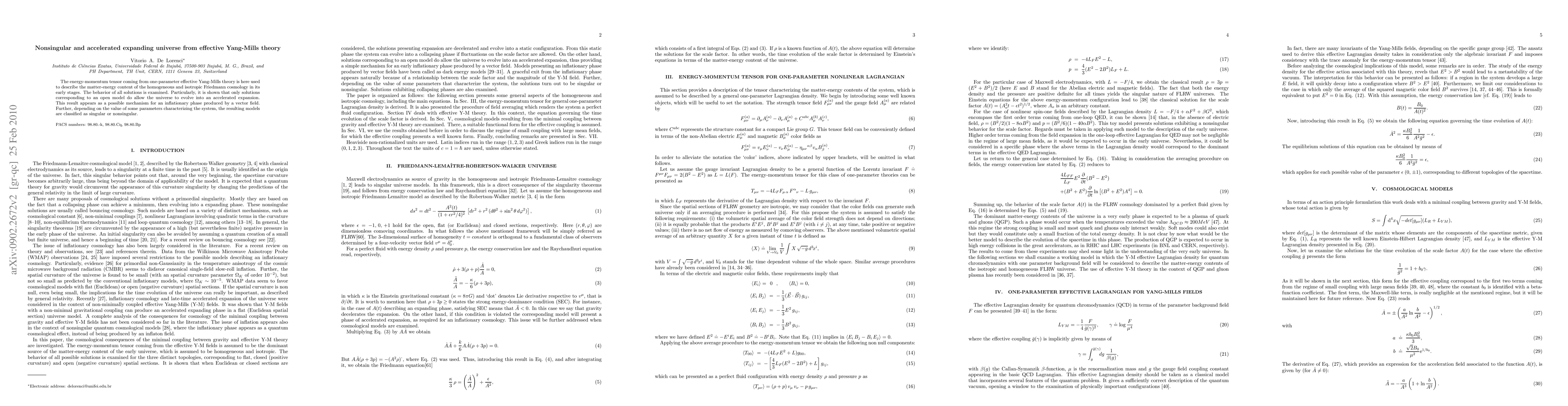 This paper uses effective Yang-Mills theory to model the early universe's matter-energy content, showing that only open models allow for accelerated expansion, potentially indicating an inflationary phase driven by a vector field. The models are classified as either singular or nonsingular based on system parameters.