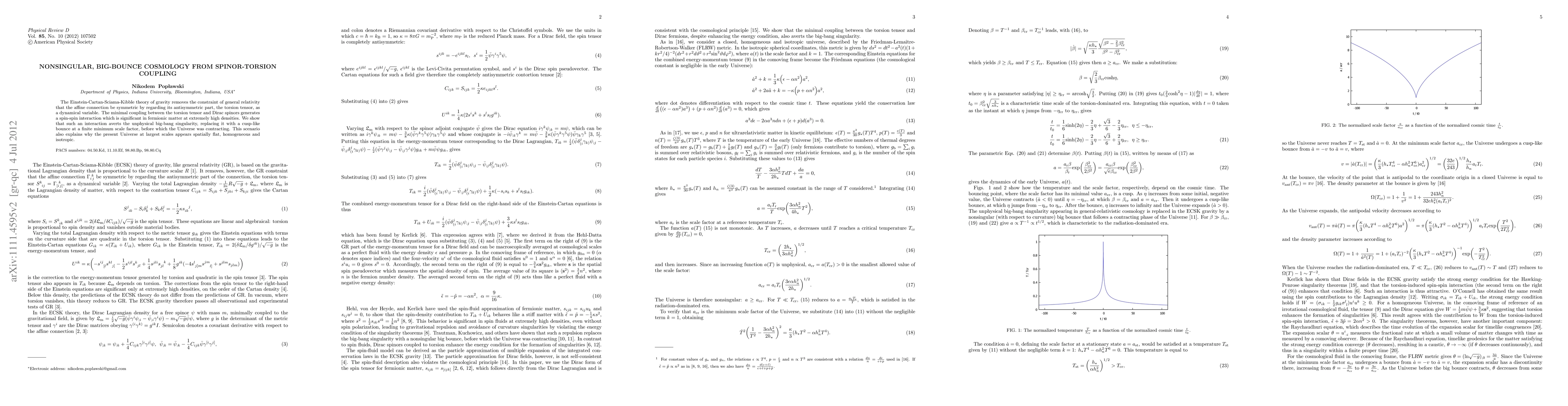 This paper proposes a nonsingular, big-bounce cosmology based on the Einstein-Cartan theory, where torsion tensor from spinor-torsion coupling replaces the big-bang singularity with a cusp-like bounce, leading to a spatially flat, homogeneous, and isotropic Universe.