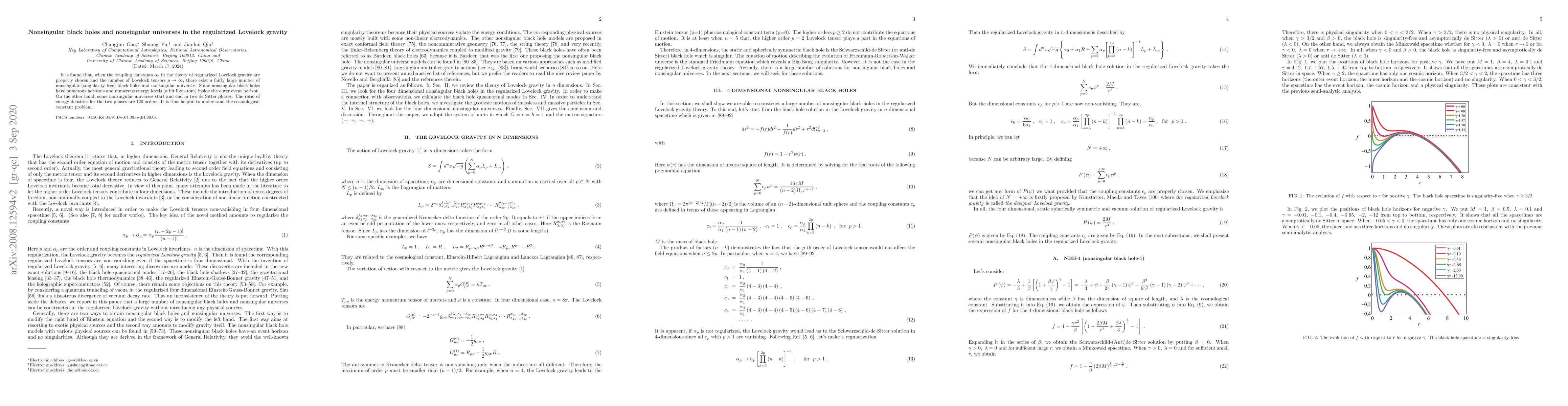 It is found that, when the coupling constants $\alpha_p$ in the theory of regularized Lovelock gravity are properly chosen and the number of Lovelock tensors $p\rightarrow \infty$, there exist a fairly large number of nonsingular (singularity free) black holes and nonsingular universes. Some nonsingular black holes have numerous horizons and numerous energy levels (a bit like atom) inside the outer event horizon. On the other hand, some nonsingular universes start and end in two de Sitter phases. The ratio of energy densities for the two phases are $120$ orders. It is thus helpful to understand the cosmological constant problem.