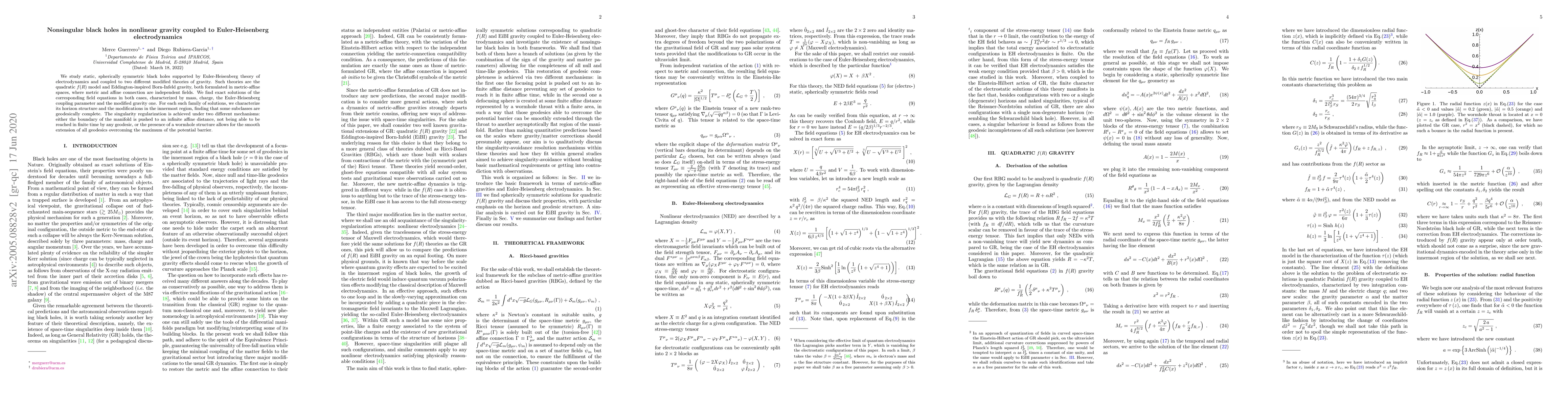 We study static, spherically symmetric black holes supported by Euler-Heisenberg theory of electrodynamics and coupled to two different modified theories of gravity. Such theories are the quadratic $f(R)$ model and Eddington-inspired Born-Infeld gravity, both formulated in metric-affine spaces, where metric and affine connection are independent fields. We find exact solutions of the corresponding field equations in both cases, characterized by mass, charge, the Euler-Heisenberg coupling parameter and the modified gravity one. For each such family of solutions, we characterize its horizon structure and the modifications in the innermost region, finding that some subclasses are geodesically complete. The singularity regularization is achieved under two different mechanisms: either the boundary of the manifold is pushed to an infinite affine distance, not being able to be reached in finite time by any geodesic, or the presence of a wormhole structure allows for the smooth extension of all geodesics overcoming the maximum of the potential barrier.