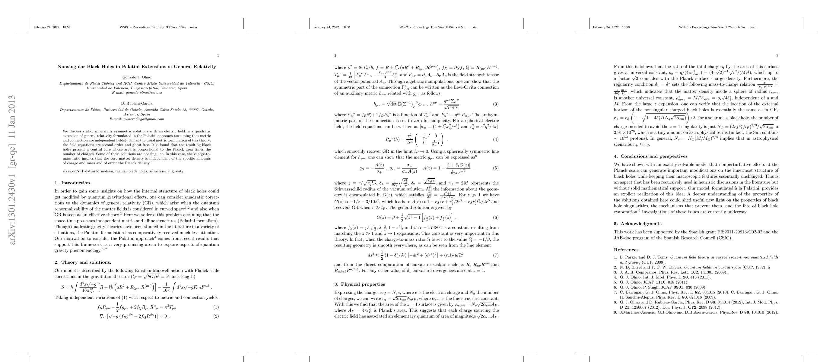 This paper explores static, spherically symmetric black holes in a Palatini extension of general relativity, finding that some solutions are nonsingular with a central core area proportional to the Planck area times the number of charges, and a core matter density of order the Planck density. The field equations are second-order and ghost-free.