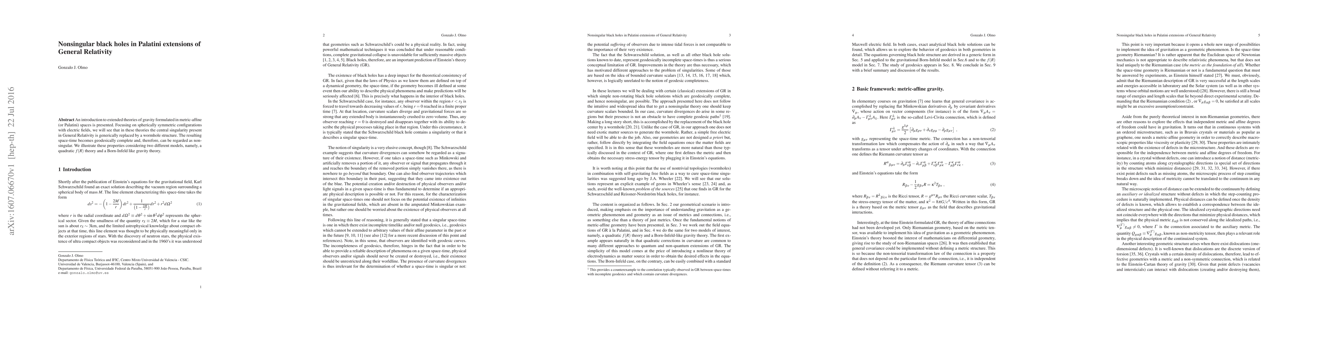 An introduction to extended theories of gravity formulated in metric-affine (or Palatini) spaces is presented. Focusing on spherically symmetric configurations with electric fields, we will see that in these theories the central singularity present in General Relativity is generically replaced by a wormhole structure. The resulting space-time becomes geodesically complete and, therefore, can be regarded as non-singular. We illustrate these properties considering two different models, namely, a quadratic $f(R)$ theory and a Born-Infeld like gravity theory.