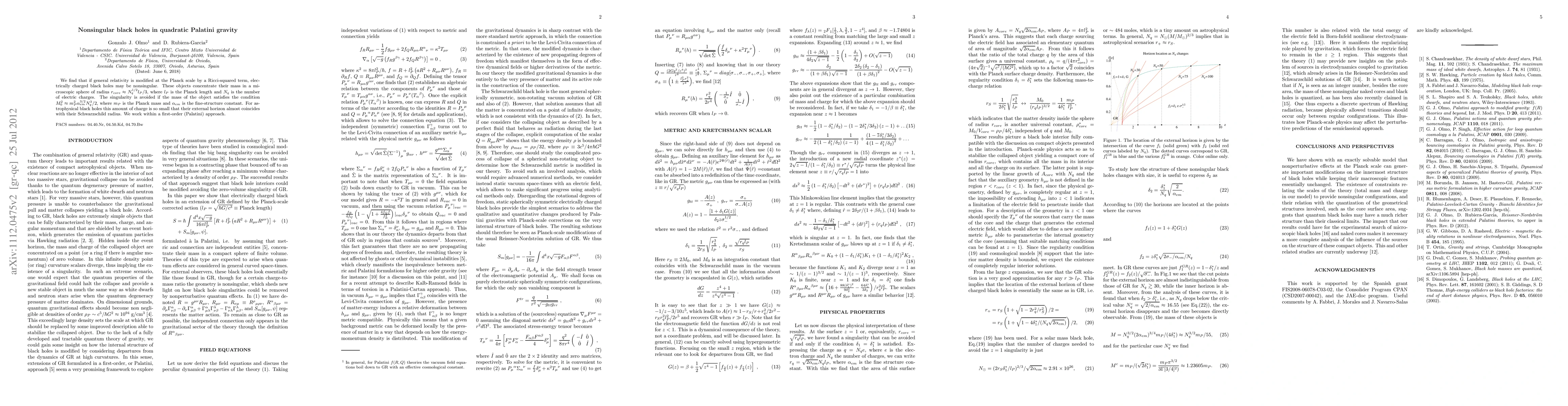 We find that if general relativity is modified at the Planck scale by a Ricci-squared term, electrically charged black holes may be nonsingular. These objects concentrate their mass in a microscopic sphere of radius $r_{core}\approx N_q^{1/2}l_P/3$, where $l_P$ is the Planck length and $N_q$ is the number of electric charges. The singularity is avoided if the mass of the object satisfies the condition $M_0^2\approx m_P^2 \alpha_{em}^{3/2} N_q^3/2$, where $m_P$ is the Planck mass and $\alpha_{em}$ is the fine-structure constant. For astrophysical black holes this amount of charge is so small that their external horizon almost coincides with their Schwarzschild radius. We work within a first-order (Palatini) approach.