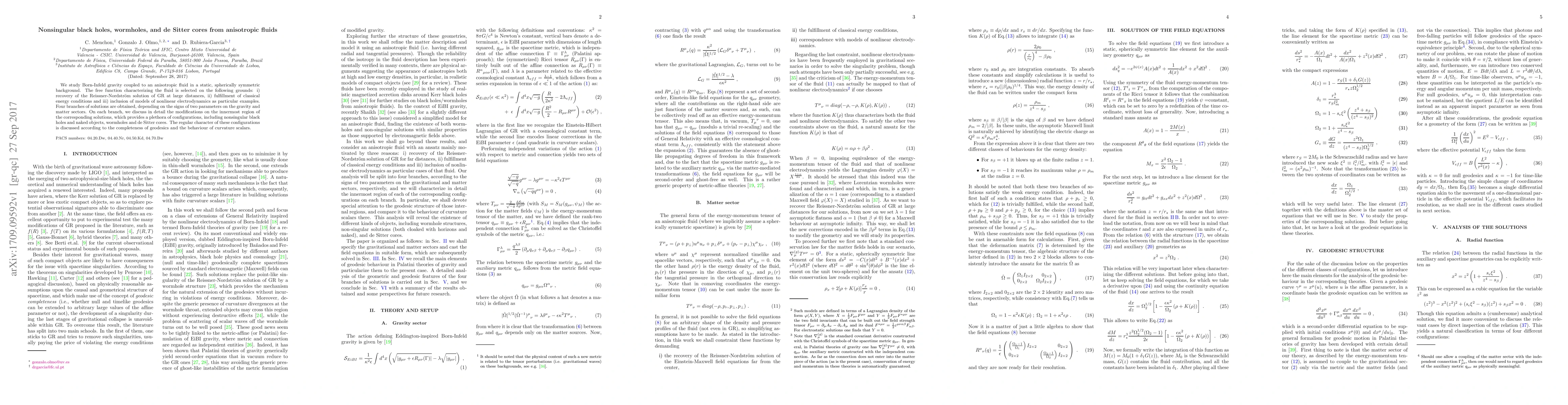 We study Born-Infeld gravity coupled to an anisotropic fluid in a static, spherically symmetric background. The free function characterizing the fluid is selected on the following grounds: i) recovery of the Reissner-Nordstr\"om solution of GR at large distances, ii) fulfillment of classical energy conditions and iii) inclusion of models of nonlinear electrodynamics as particular examples. Four branches of solutions are obtained, depending on the signs of two parameters on the gravity and matter sectors. On each branch, we discuss in detail the modifications on the innermost region of the corresponding solutions, which provides a plethora of configurations, including nonsingular black holes and naked objects, wormholes and de Sitter cores. The regular character of these configurations is discussed according to the completeness of geodesics and the behaviour of curvature scalars.