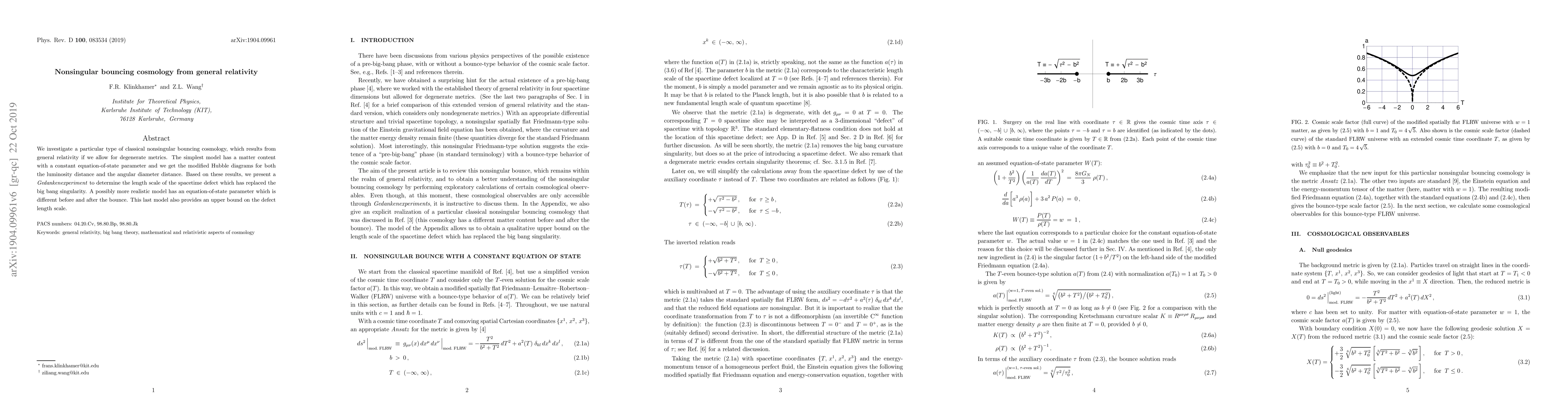 We investigate a particular type of classical nonsingular bouncing cosmology, which results from general relativity if we allow for degenerate metrics. The simplest model has a matter content with a constant equation-of-state parameter and we get the modified Hubble diagrams for both the luminosity distance and the angular diameter distance. Based on these results, we present a Gedankenexperiment to determine the length scale of the spacetime defect which has replaced the big bang singularity. A possibly more realistic model has an equation-of-state parameter which is different before and after the bounce. This last model also provides an upper bound on the defect length scale.