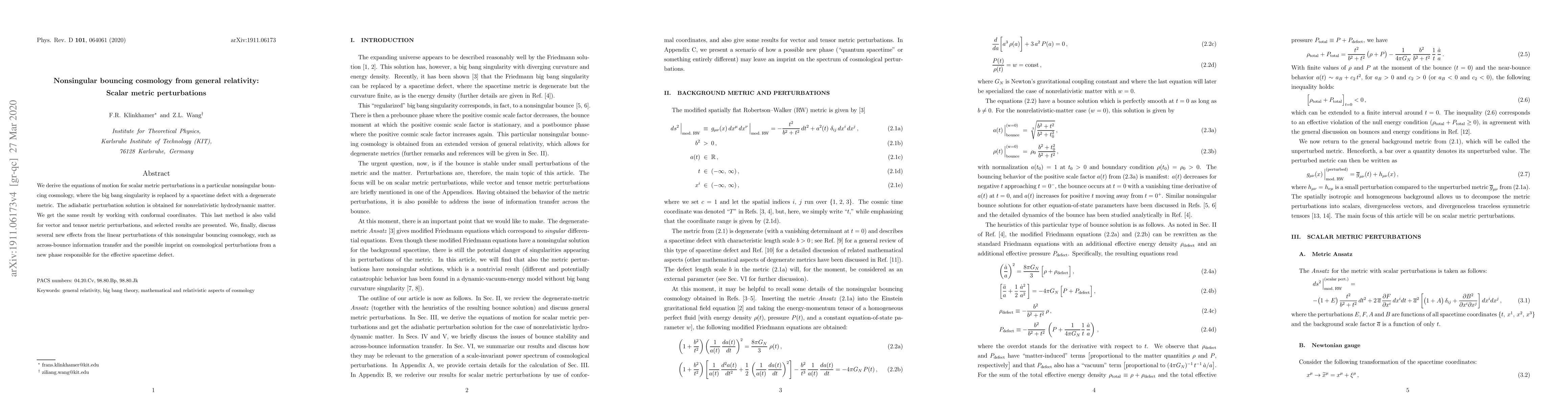 This paper derives equations for scalar metric perturbations in a nonsingular bouncing cosmology, replacing the big bang singularity with a spacetime defect. It also explores new effects like across-bounce information transfer and potential imprints on cosmological perturbations due to this defect.