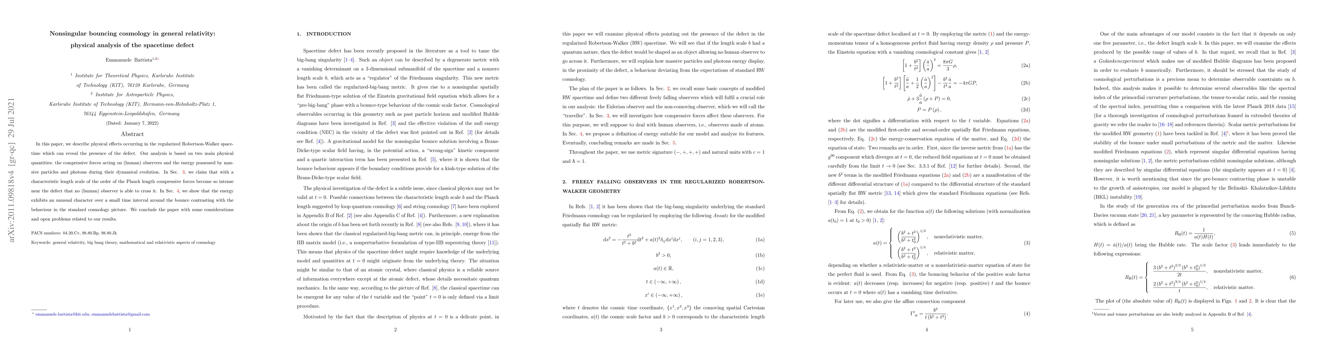In this paper, we describe physical effects occurring in the regularized Robertson-Walker spacetime which can reveal the presence of the defect. Our analysis is based on two main physical quantities: the compressive forces acting on (human) observers and the energy possessed by massive particles and photons during their dynamical evolution. In Sec. 3, we claim that with a characteristic length scale of the order of the Planck length compressive forces become so intense near the defect that no (human) observer is able to cross it. In Sec. 4, we show that the energy exhibits an unusual character over a small time interval around the bounce contrasting with the behaviour in the standard cosmology picture. We conclude the paper with some considerations and open problems related to our results.