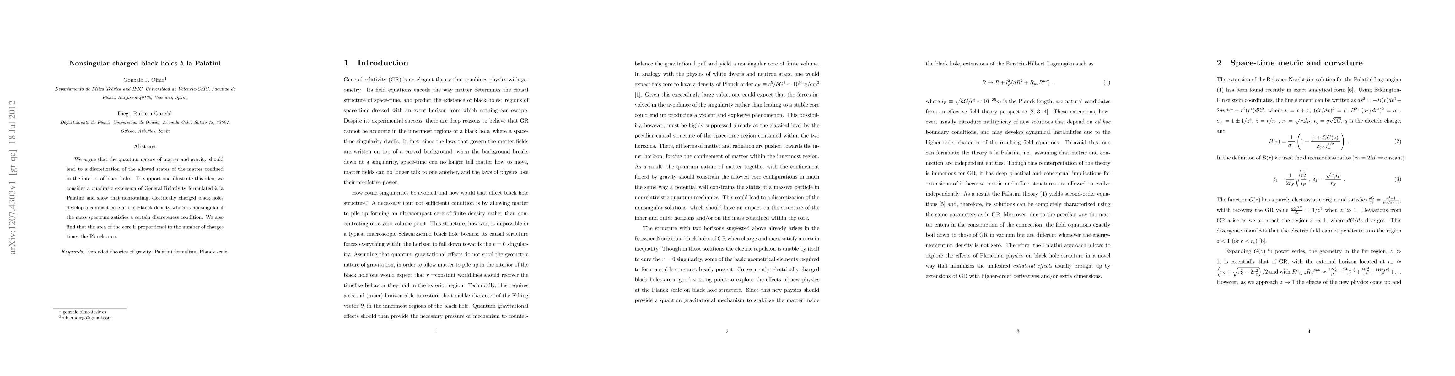 This research proposes that quantum effects in matter and gravity create a discrete spectrum for black hole states. It uses a Palatini-formulated quadratic extension of General Relativity to demonstrate that nonrotating, charged black holes develop a nonsingular compact core at Planck density, with its area proportional to the product of charge number and Planck area.
