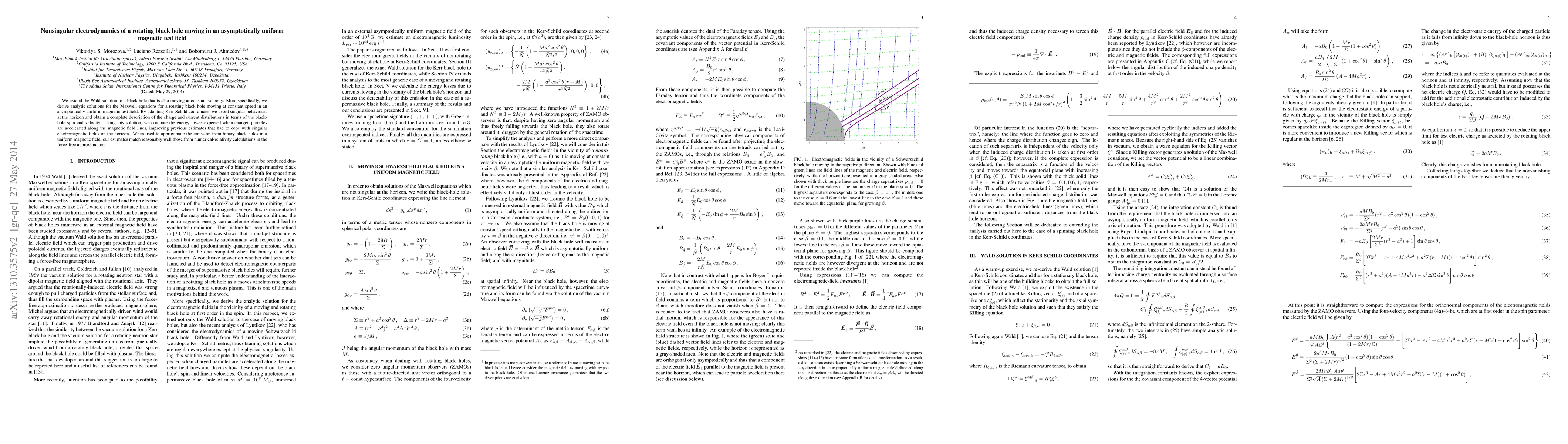 This paper extends the Wald solution to describe a rotating black hole boosted in an asymptotically uniform magnetic field, deriving analytic solutions for Maxwell's equations using Kerr-Schild coordinates. The study provides a complete description of charge and current distributions, improving energy loss estimates for accelerated charged particles and matching numerical relativity calculations for binary black hole emissions.