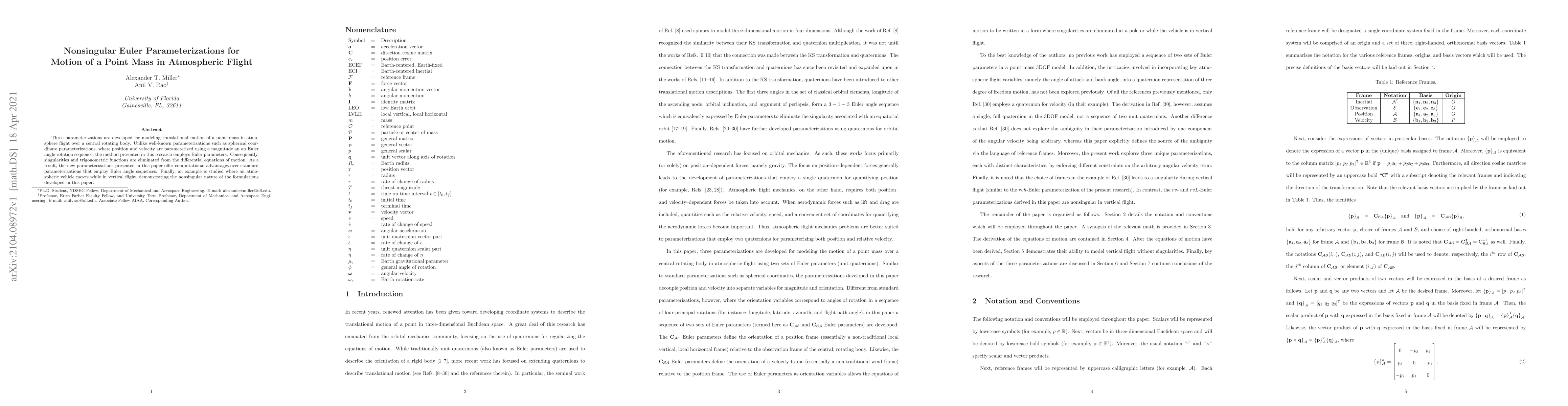 Three parameterizations are developed for modeling translational motion of a point mass in atmosphere flight over a central rotating body. Unlike well-known parameterizations such as spherical coordinate parameterizations, where position and velocity are parameterized using a magnitude an an Euler angle rotation sequence, the method presented in this research employs Euler parameters. Consequently, singularities and trigonometric functions are eliminated from the differential equations of motion. As a result, the new parameterizations presented in this paper offer computational advantages over standard parameterizations that employ Euler angle sequences. Finally, an example is studied where an atmospheric vehicle moves while in vertical flight, demonstrating the nonsingular nature of the formulations developed in this paper.