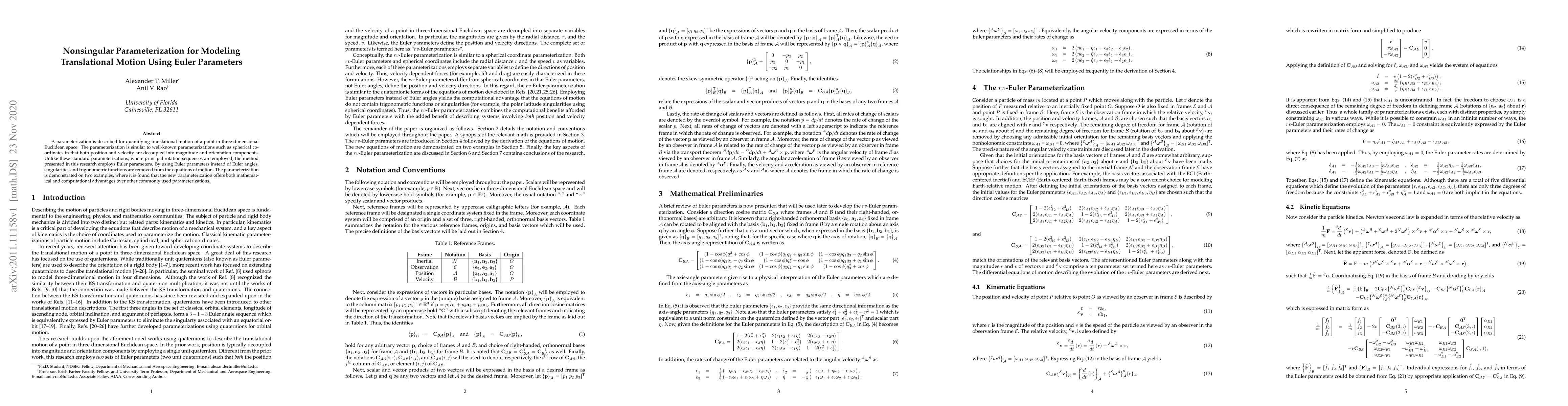A parameterization is described for quantifying translational motion of a point in three-dimensional Euclidean space. The parameterization is similar to well-known parameterizations such as spherical coordinates in that both position and velocity are decoupled into magnitude and orientation components. Unlike these standard parameterizations, where principal rotation sequences are employed, the method presented in this research employs Euler parameters. By using Euler parameters instead of Euler angles, singularities and trigonometric functions are removed from the equations of motion. The parameterization is demonstrated on two examples, where it is found that the new parameterization offers both mathematical and computational advantages over other commonly used parameterizations.