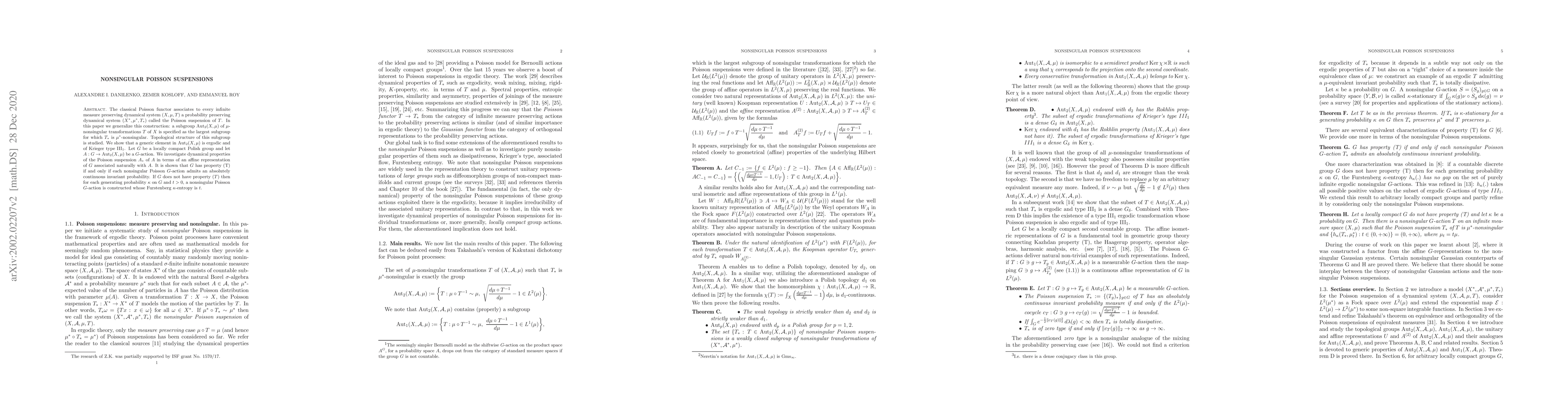 The classical Poisson functor associates to every infinite measure preserving dynamical system $(X,\mu,T)$ a probability preserving dynamical system $(X^*,\mu^*,T_*)$ called the Poisson suspension of $T$. In this paper we generalize this construction: a subgroup Aut$_2(X,\mu)$ of $\mu$-nonsingular transformations $T$ of $X$ is specified as the largest subgroup for which $T_*$ is $\mu^*$-nonsingular. Topological structure of this subgroup is studied. We show that a generic element in Aut$_2(X,\mu)$ is ergodic and of Krieger type III$_1$. Let $G$ be a locally compact Polish group and let $A:G\to\text{Aut}_2(X,\mu)$ be a $G$-action. We investigate dynamical properties of the Poisson suspension $A_*$ of $A$ in terms of an affine representation of $G$ associated naturally with $A$. It is shown that $G$ has property (T) if and only if each nonsingular Poisson $G$-action admits an absolutely continuous invariant probability. If $G$ does not have property $(T)$ then for each generating probability $\kappa$ on $G$ and $t>0$, a nonsingular Poisson $G$-action is constructed whose Furstenberg $\kappa$-entropy is $t$.