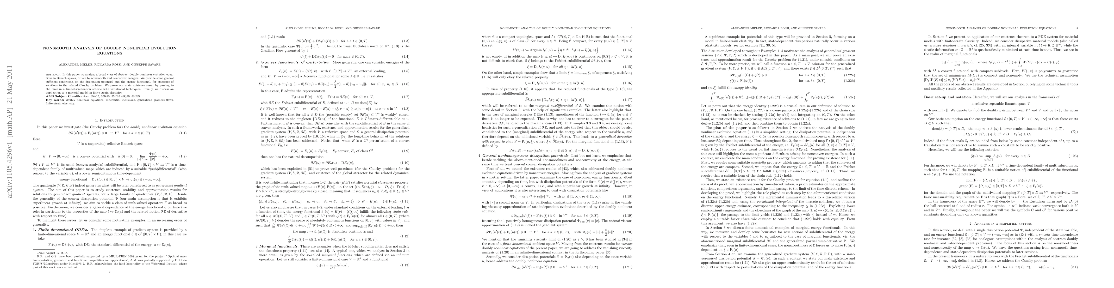 This paper investigates abstract doubly nonlinear evolution equations in Banach spaces with nonsmooth and nonconvex energies, establishing sufficient conditions for solution existence. The main result is proven via variational techniques applied to a time-discretization scheme, with an application to finite-strain elasticity models.
