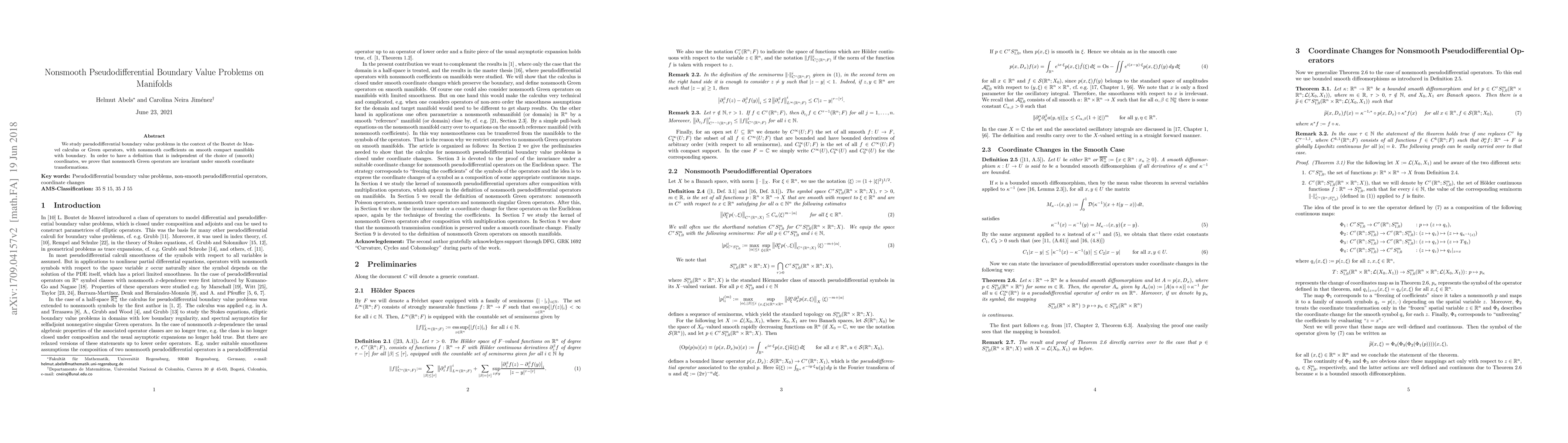 This paper investigates pseudodifferential boundary value problems with nonsmooth coefficients on smooth compact manifolds. It demonstrates the invariance of nonsmooth Green operators under smooth coordinate transformations, ensuring a coordinate-independent definition.