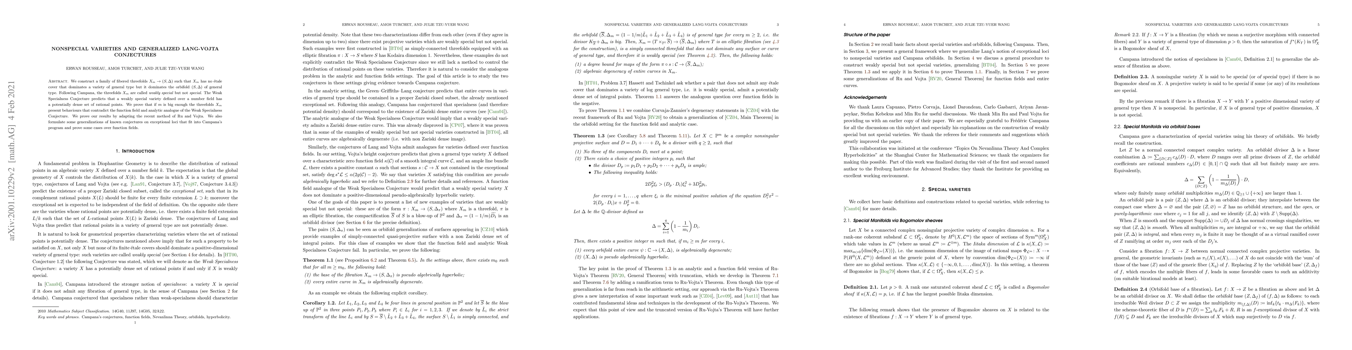 We construct a family of fibered threefolds $X_m \to (S , \Delta)$ such that $X_m$ has no \'etale cover that dominates a variety of general type but it dominates the orbifold $(S,\Delta)$ of general type. Following Campana, the threefolds $X_m$ are called \emph{weakly special} but not \emph{special}. The Weak Specialness Conjecture predicts that a weakly special variety defined over a number field has a potentially dense set of rational points. We prove that if $m$ is big enough the threefolds $X_m$ present behaviours that contradict the function field and analytic analogue of the Weak Specialness Conjecture. We prove our results by adapting the recent method of Ru and Vojta. We also formulate some generalizations of known conjectures on exceptional loci that fit into Campana's program and prove some cases over function fields.
