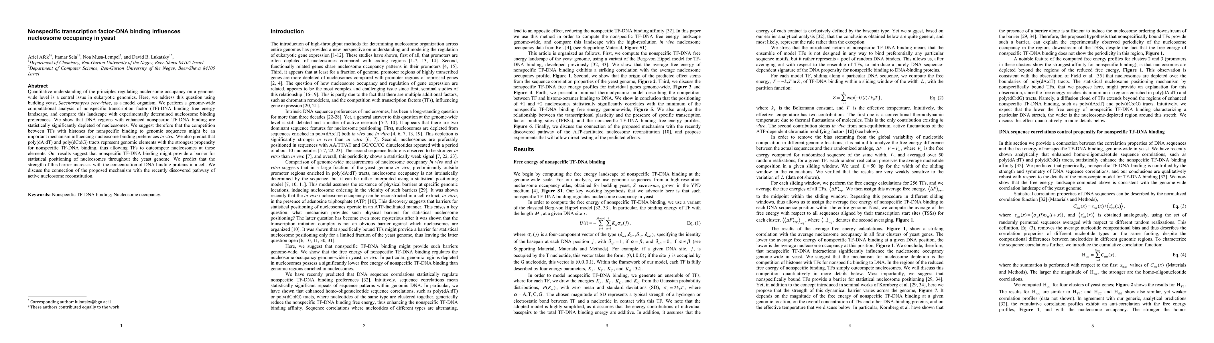 The paper presents a novel computational approach to analyze nonspecific TF-DNA binding free energy landscapes and their relationship with nucleosome occupancy, providing insights into the competition between TFs and histones for binding to genomic sequences.
