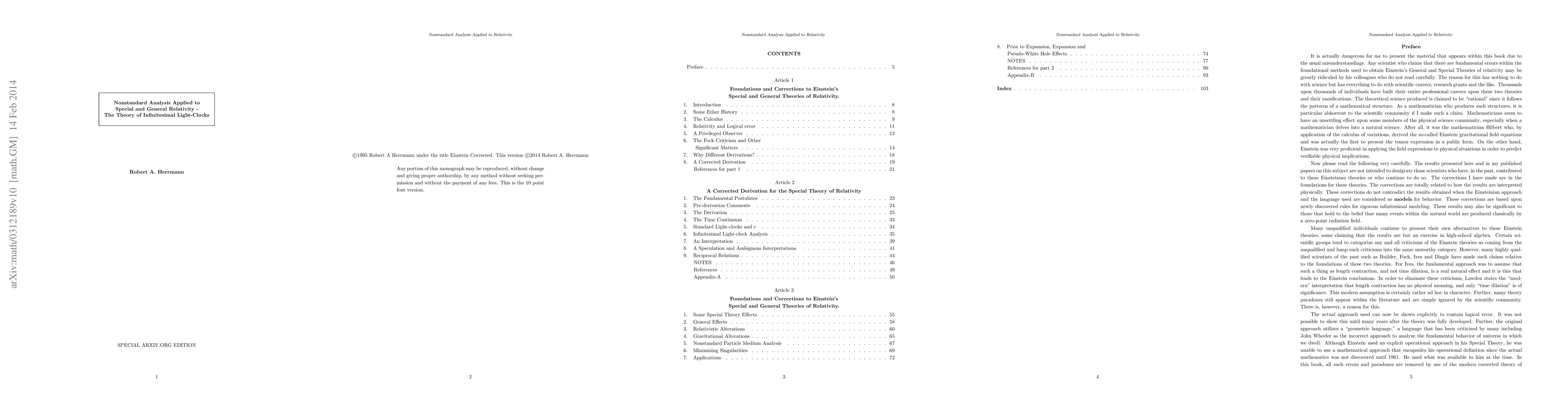 Nonstandard analysis and electromagnetic propagation properties are used to derive all of the fundamental results for the Special Theory of Relativity. Infinitesimal modeling via infinitesimal light-clocks is used to derive two general line-elements (metrics) without the use of Riemannian geometry. By substituting potential velocities, the Schwarzschild, quasi and modified Schwarzschild, de Sitter, Robertson-Walker and similar line-elements are derived. New black hole and quasi-white hole investigations are presented. A new fixed method using separating operators is used to obtain the major predictions for the relativistic alterations in natural-system behavior. The major conclusion is that all such changes are related to electromagnetic properties and that Riemannian geometry is but an analogue model for natural-system behavior.