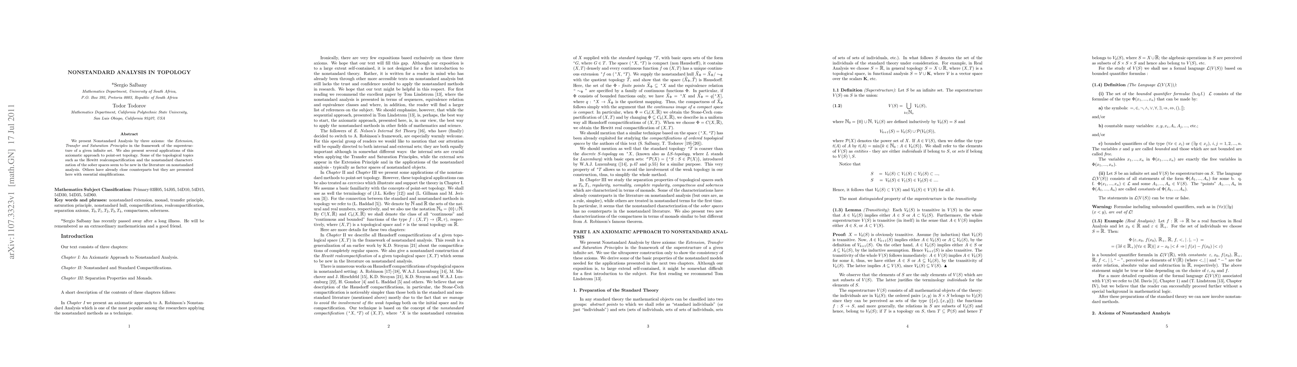 We present Nonstandard Analysis by three axioms: the {\em Extension, Transfer and Saturation Principles} in the framework of the superstructure of a given infinite set. We also present several applications of this axiomatic approach to point-set topology. Some of the topological topics such as the Hewitt realcompactification and the nonstandard characterization of the sober spaces seem to be new in the literature on nonstandard analysis. Others have already close counterparts but they are presented here with essential simplifications.