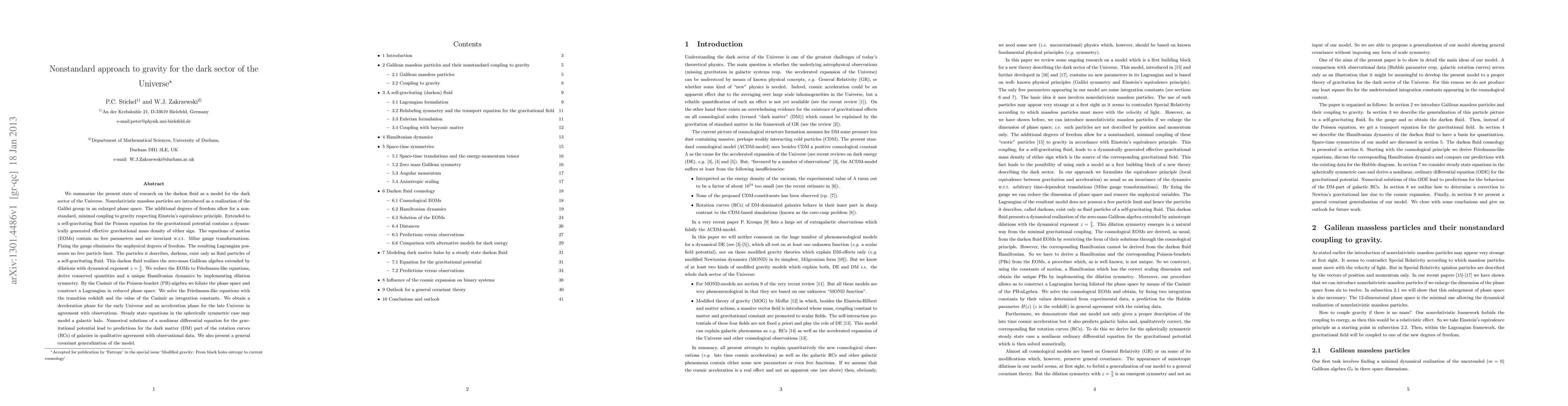 We summarize the present state of research on the darkon fuid as a model for the dark sector of the Universe. Nonrelativistic massless particles are introduced as a realization of the Galilei group in an enlarged phase space. The additional degrees of freedom allow for a nonstandard, minimal coupling to gravity respecting Einstein's equivalence principle. Extended to a self-gravitating fluid the Poisson equation for the gravitational potential contains a dynamically generated effective gravitational mass density of either sign. The equations of motion (EOMs) contain no free parameters and are invariant w.r.t. Milne gauge transformations. Fixing the gauge eliminates the unphysical degrees of freedom. The resulting Lagrangian possesses no free particle limit. The particles it describes, darkons, exist only as fluid particles of a self-gravitating fluid. This darkon fluid realizes the zero-mass Galilean algebra extended by dilations with dynamical exponent z = 5/3. We reduce the EOMs to Friedmann-like equations, derive conserved quantities and a unique Hamiltonian dynamics by implementing dilation symmetry. By the Casimir of the Poisson-bracket (PB)-algebra we foliate the phase space and construct a Lagrangian in reduced phase space. We solve the Friedmann-like equations with the transition redshift and the value of the Casimir as integration constants. We obtain a deceleration phase for the early Universe and an acceleration phase for the late Universe in agreement with observations. Steady state equations in the spherically symmetric case may model a galactic halo. Numerical solutions of a nonlinear differential equation for the gravitational potential lead to predictions for the dark matter (DM) part of the rotation curves (RCs) of galaxies in qualitative agreement with observational data. We also present a general covariant generalization of the model.