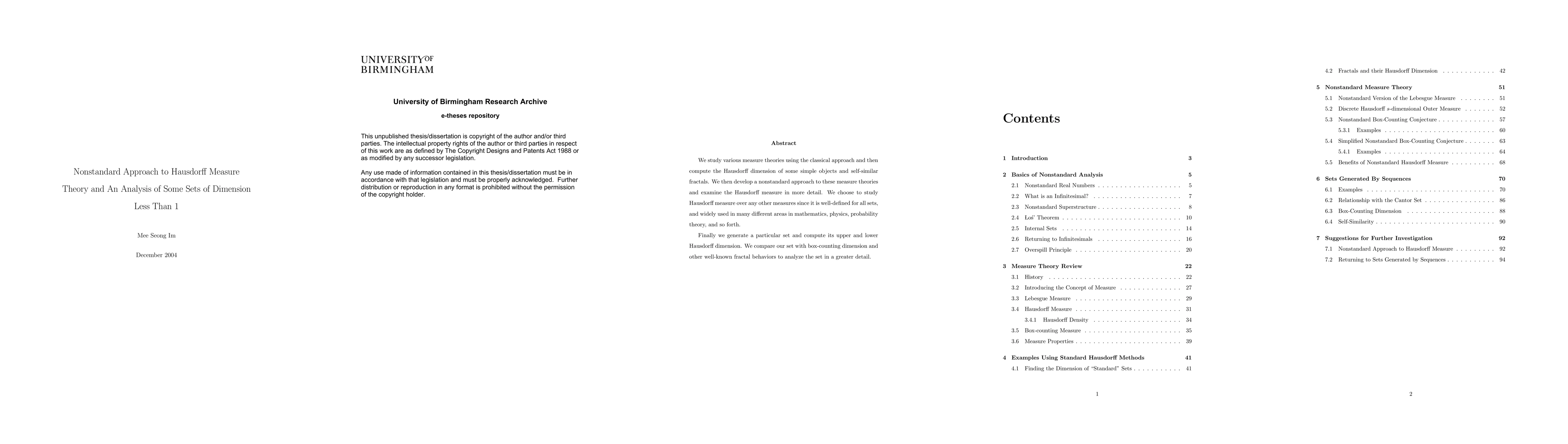 We study various measure theories using the classical approach and then compute the Hausdorff dimension of some simple objects and self-similar fractals. We then develop a nonstandard approach to these measure theories and examine the Hausdorff measure in more detail. We choose to study Hausdorff measure over any other measures since it is well-defined for all sets, and widely used in many different areas in mathematics, physics, probability theory, and so forth. Finally we generate a particular set and compute its upper and lower Hausdorff dimension. We compare our set with box-counting dimension and other well-known fractal behaviors to analyze the set in a greater detail.